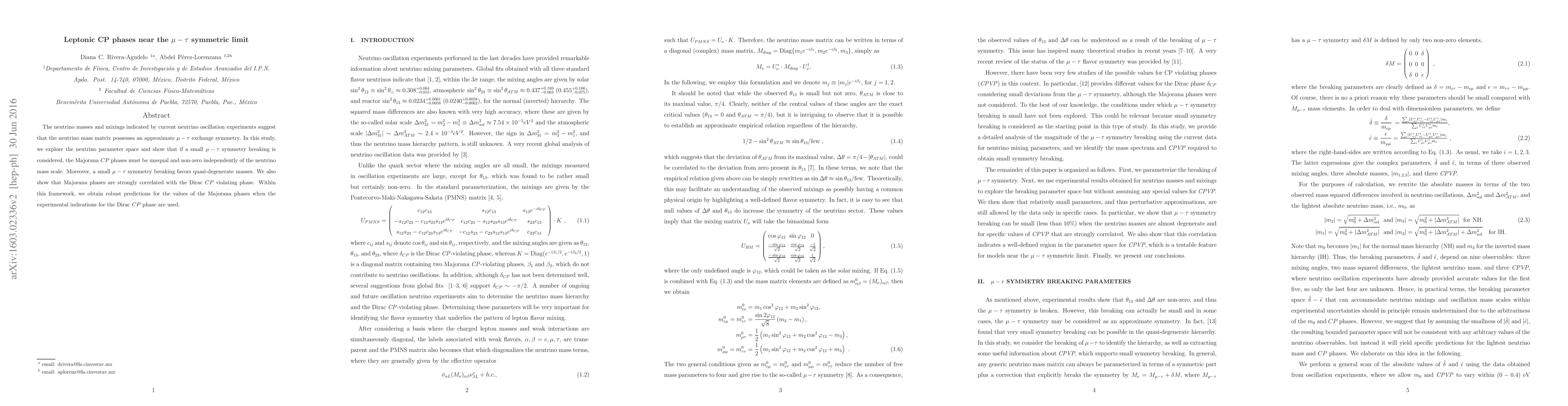 The paper investigates neutrino parameters near the $mu- au$ symmetry limit, finding that even small symmetry breaking implies non-zero and unequal Majorana CP phases, independent of neutrino mass scale. It also reveals a correlation between Majorana and Dirac CP violation phases, offering predictions for Majorana phases given experimental data on the Dirac phase.