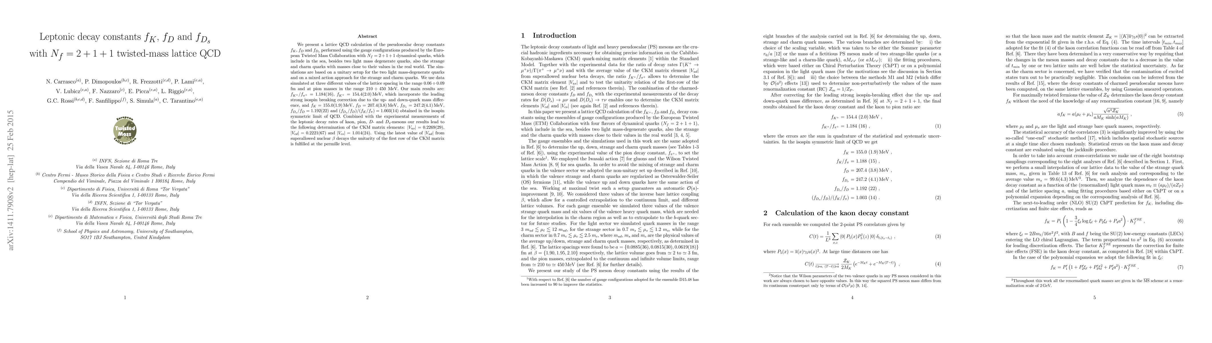 This paper reports lattice QCD calculations of pseudoscalar decay constants fK, fD, and fDs using Nf = 2+1+1 twisted-mass fermions. The results include fK+ = 154.4 (2.0) MeV and fDs = 247.2 (4.1) MeV, leading to precise CKM matrix elements |Vus| = 0.2269 (29) and confirming the unitarity of the first row of the CKM matrix.