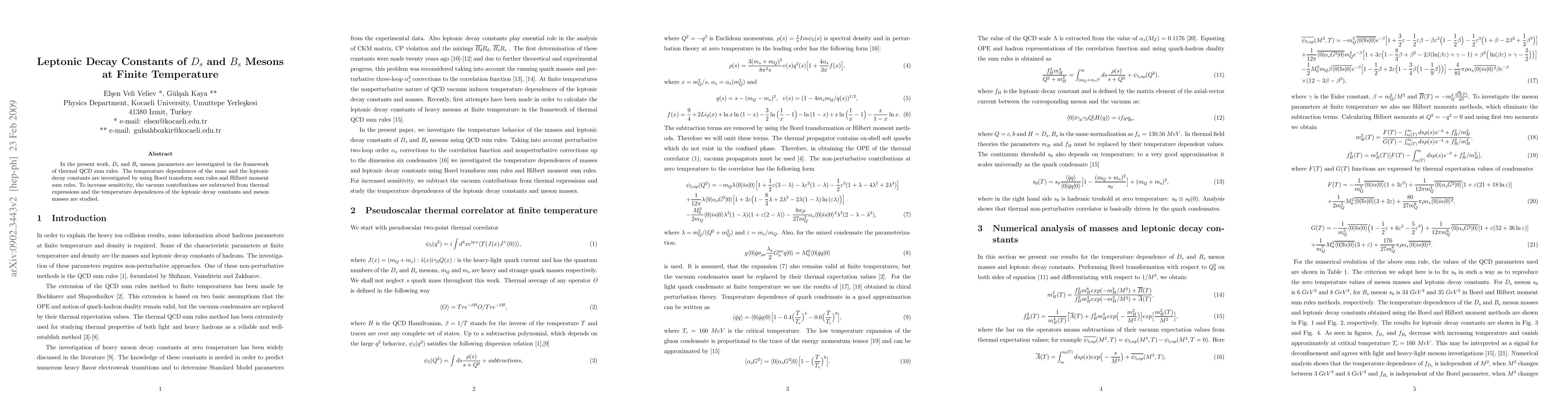 In the present work, $D_{s}$ and $B_{s}$ meson parameters are investigated in the framework of thermal QCD sum rules. The temperature dependence of the mass and the leptonic decay constants are investigated by using Borel transform sum rules and Hilbert moment sum rules. To increase sensitivity, the vacuum contributions are subtracted from thermal expressions and the temperature dependences of the leptonic decay constants and meson masses are studied.