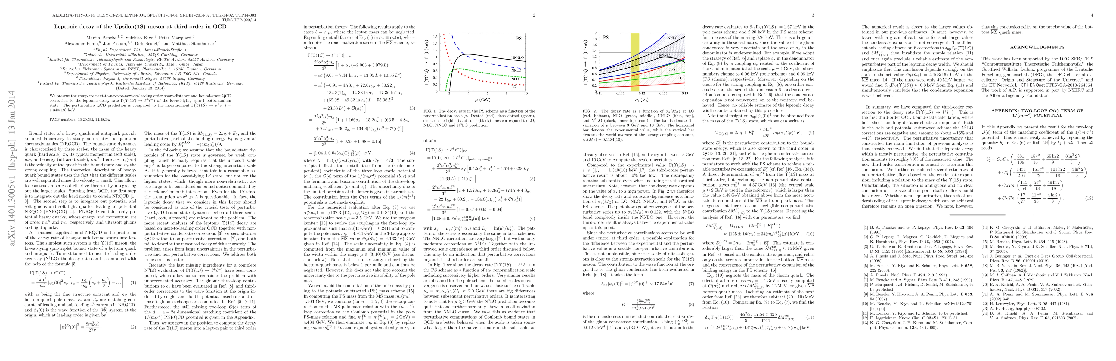Researchers calculated the leptonic decay rate of the Upsilon(1S) meson with a QCD correction, comparing it to an experimental measurement, finding agreement within error margins.