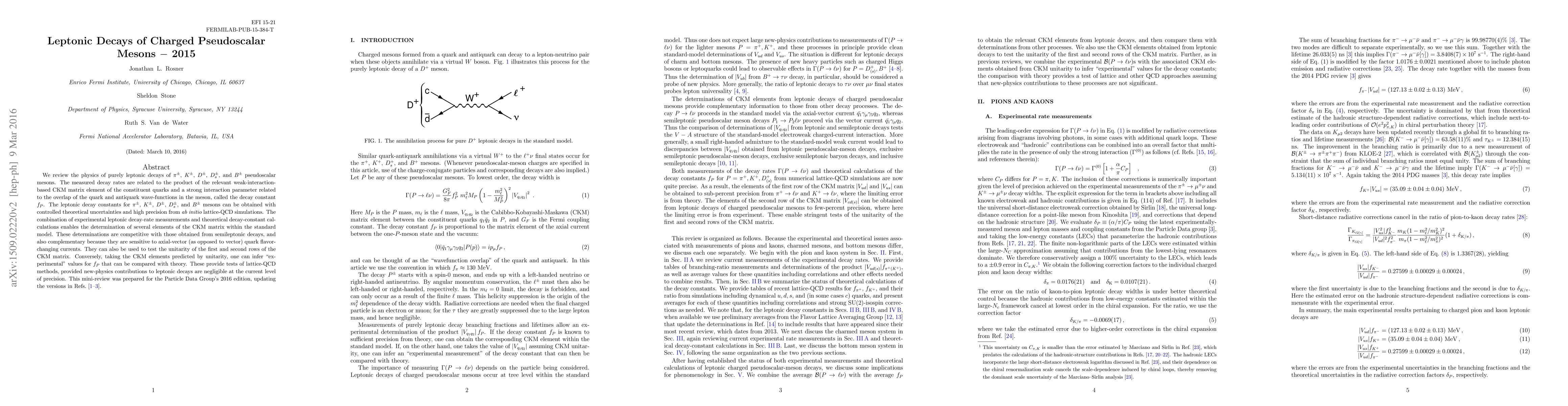 This paper reviews the physics of leptonic decays of charged pseudoscalar mesons, linking measured decay rates to the CKM matrix and decay constants from lattice-QCD simulations. The study highlights the competitive and complementary nature of these decay measurements in determining CKM matrix elements and testing the unitarity of the matrix.