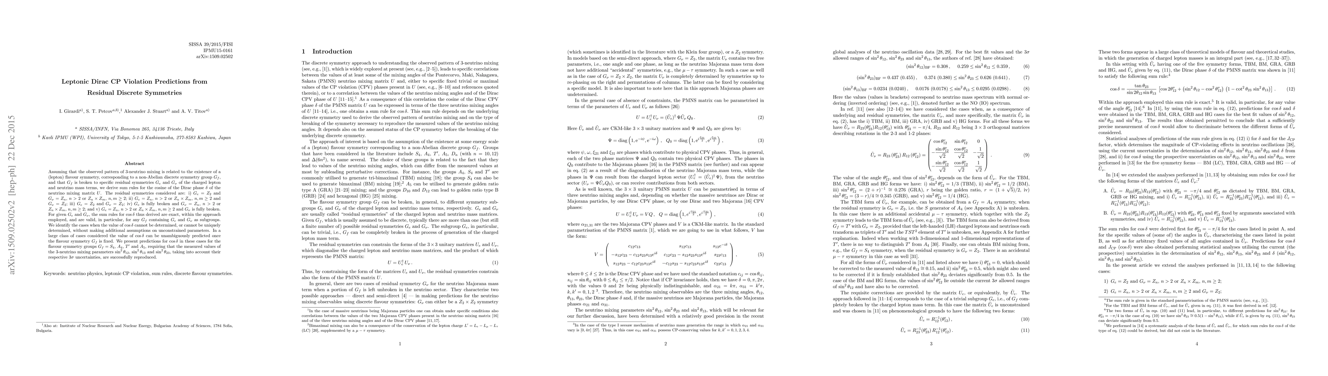 Assuming that the observed pattern of 3-neutrino mixing is related to the existence of a (lepton) flavour symmetry, corresponding to a non-Abelian discrete symmetry group $G_f$, and that $G_f$ is broken to specific residual symmetries $G_e$ and $G_\nu$ of the charged lepton and neutrino mass terms, we derive sum rules for the cosine of the Dirac phase $\delta$ of the neutrino mixing matrix $U$. The residual symmetries considered are: i) $G_e = Z_2$ and $G_{\nu} = Z_n$, $n > 2$ or $Z_n \times Z_m$, $n,m \geq 2$; ii) $G_e = Z_n$, $n > 2$ or $Z_n \times Z_m$, $n,m \geq 2$ and $G_{\nu} = Z_2$; iii) $G_e = Z_2$ and $G_{\nu} = Z_2$; iv) $G_e$ is fully broken and $G_{\nu} = Z_n$, $n > 2$ or $Z_n \times Z_m$, $n,m \geq 2$; and v) $G_e = Z_n$, $n > 2$ or $Z_n \times Z_m$, $n,m \geq 2$ and $G_{\nu}$ is fully broken. For given $G_e$ and $G_\nu$, the sum rules for $\cos\delta$ thus derived are exact, within the approach employed, and are valid, in particular, for any $G_f$ containing $G_e$ and $G_\nu$ as subgroups. We identify the cases when the value of $\cos\delta$ cannot be determined, or cannot be uniquely determined, without making additional assumptions on unconstrained parameters. In a large class of cases considered the value of $\cos\delta$ can be unambiguously predicted once the flavour symmetry $G_f$ is fixed. We present predictions for $\cos\delta$ in these cases for the flavour symmetry groups $G_f = S_4$, $A_4$, $T^\prime$ and $A_5$, requiring that the measured values of the 3-neutrino mixing parameters $\sin^2\theta_{12}$, $\sin^2\theta_{13}$ and $\sin^2\theta_{23}$, taking into account their respective $3\sigma$ uncertainties, are successfully reproduced.