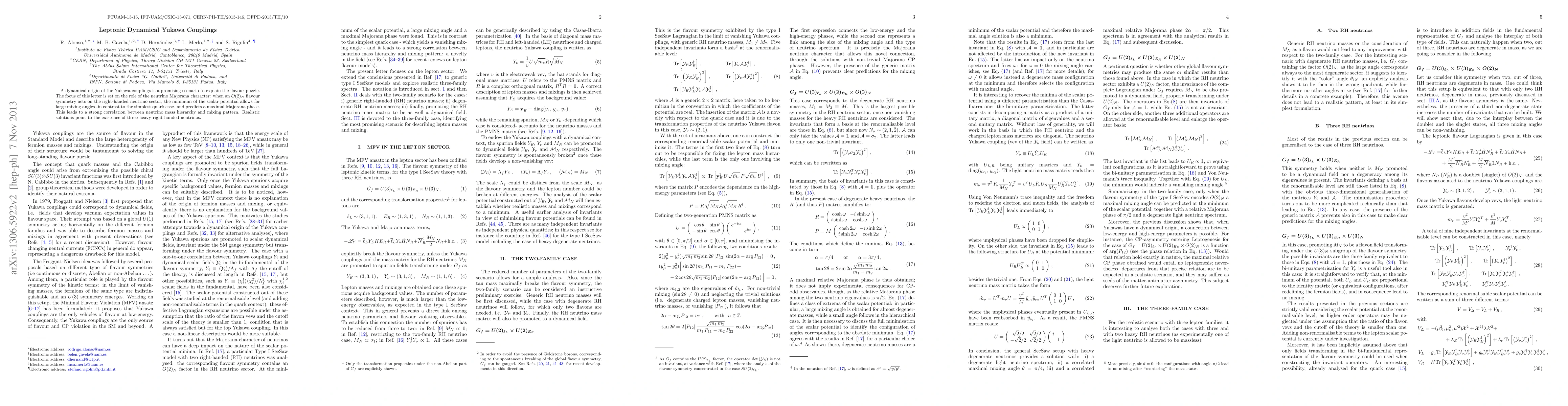 A dynamical origin of the Yukawa couplings is a promising scenario to explain the flavour puzzle. The focus of this letter is set on the role of the neutrino Majorana character: when an $O(2)_{N_R}$ flavour symmetry acts on the right-handed neutrino sector, the minimum of the scalar potential allows for large mixing angles -in contrast to the simplest quark case- and predicts a maximal Majorana phase. This leads to a strong correlation between neutrino mass hierarchy and mixing pattern. Realistic solutions point to the existence of three heavy right-handed neutrinos.