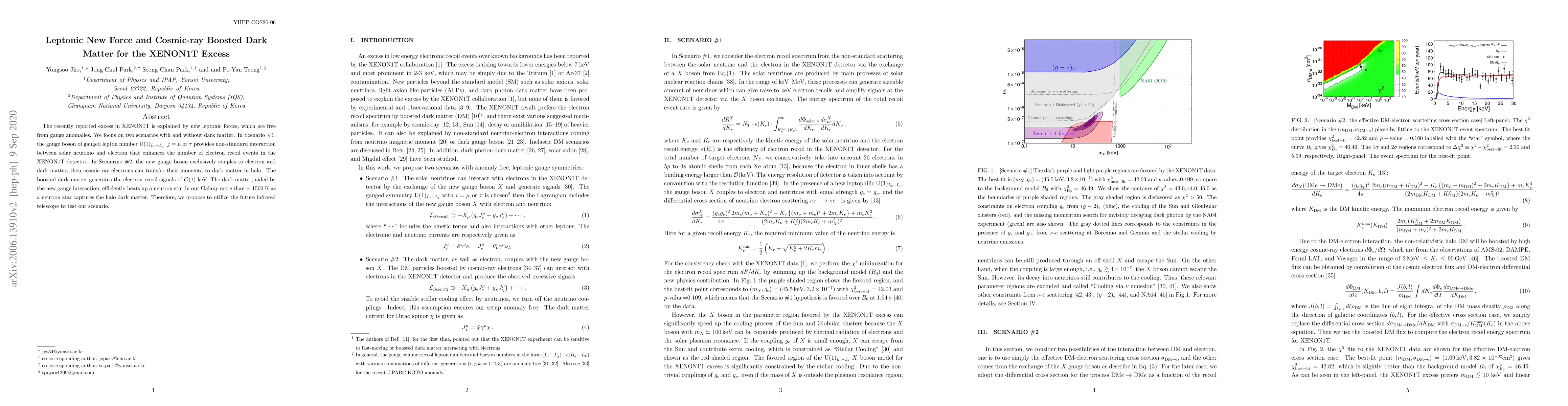 The recently reported excess in XENON1T is explained by new leptonic forces, which are free from gauge anomalies. We focus on two scenarios with and without dark matter. In Scenario #1, the gauge boson of gauged lepton number U(1)$_{L_e-L_j}$, $j=\mu$ or $\tau$ provides non-standard interaction between solar neutrino and electron that enhances the number of electron recoil events in the XENON1T detector. In Scenario #2, the new gauge boson exclusively couples to electron and dark matter, then cosmic-ray electrons can transfer their momenta to dark matter in halo. The boosted dark matter generates the electron recoil signals of ${\cal O}(1)$ keV. The dark matter, aided by the new gauge interaction, efficiently heats up a neutron star in our Galaxy more than $\sim1500$ K as a neutron star captures the halo dark matter. Therefore, we propose to utilize the future infrared telescope to test our scenario.