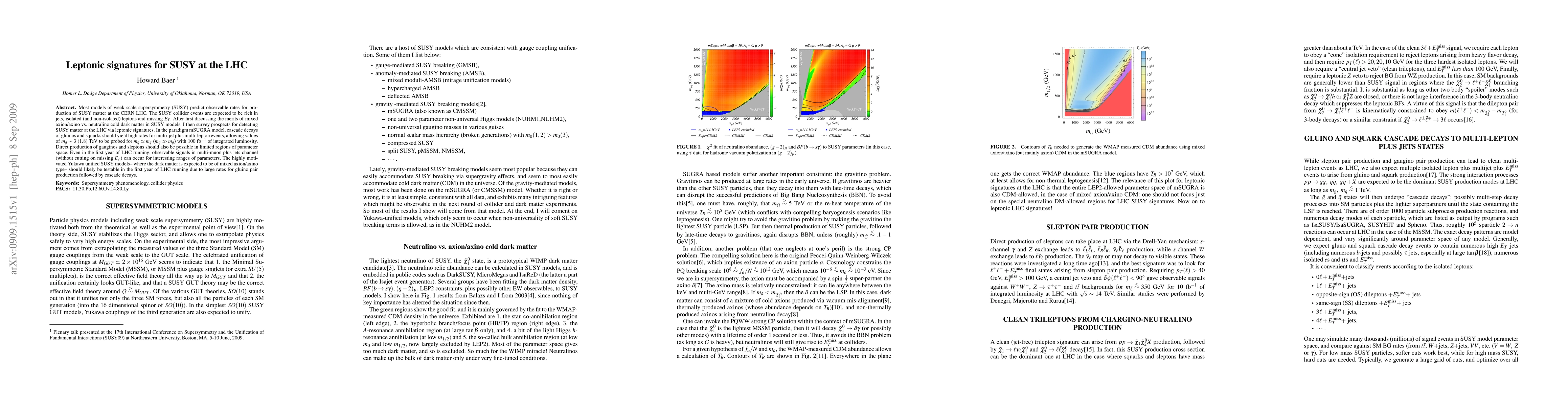 This paper discusses the potential for detecting weak scale supersymmetry (SUSY) at the LHC through leptonic signatures, focusing on multi-jet plus multi-lepton events. It highlights that in the mSUGRA model, gluino and squark cascade decays can probe gluino masses up to 3 TeV with sufficient luminosity, and suggests that Yukawa unified SUSY models with mixed axion/axino dark matter may yield detectable signals in the first year of LHC operation.