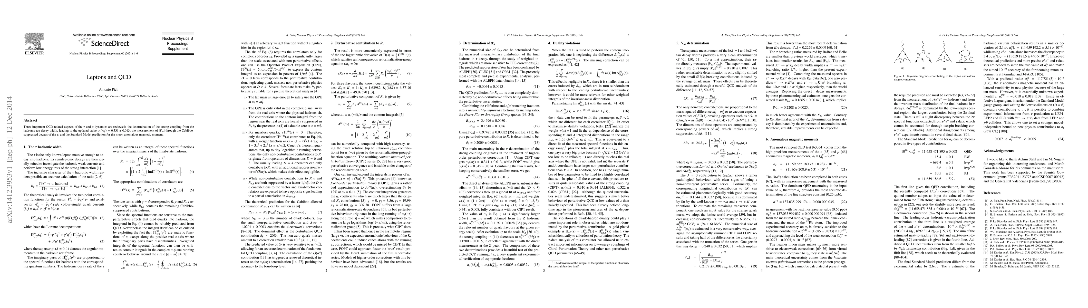Three important QCD-related aspects of the $\tau$ and $\mu$ dynamics are reviewed: the determination of the strong coupling from the hadronic tau decay width, leading to the updated value $\alpha_s(m_\tau^2) = 0.331 \pm 0.013$; the measurement of $|V_{us}|$ through the Cabibbo-suppressed decays of the $\tau$, and the Standard Model prediction for the muon anomalous magnetic moment.