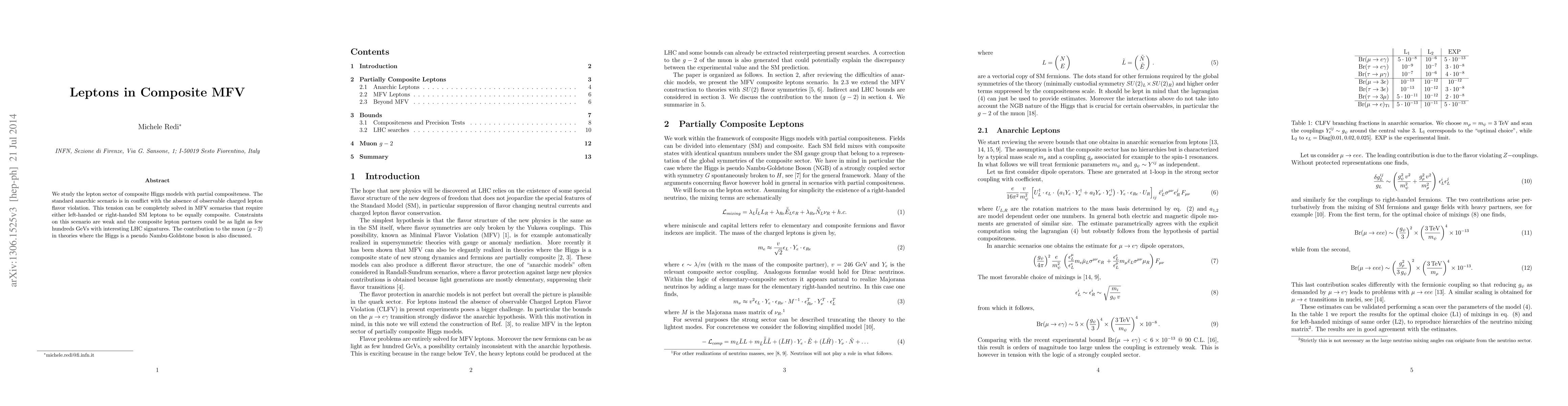 We study the lepton sector of composite Higgs models with partial compositeness. The standard anarchic scenario is in conflict with the absence of observable charged lepton flavor violation. This tension can be completely solved in MFV scenarios that require either left-handed or right-handed SM leptons to be equally composite. Constraints on this scenario are weak and the composite lepton partners could be as light as few hundreds GeVs with interesting LHC signatures. The contribution to the muon (g-2) in theories where the Higgs is a pseudo Nambu-Goldstone boson is also discussed.