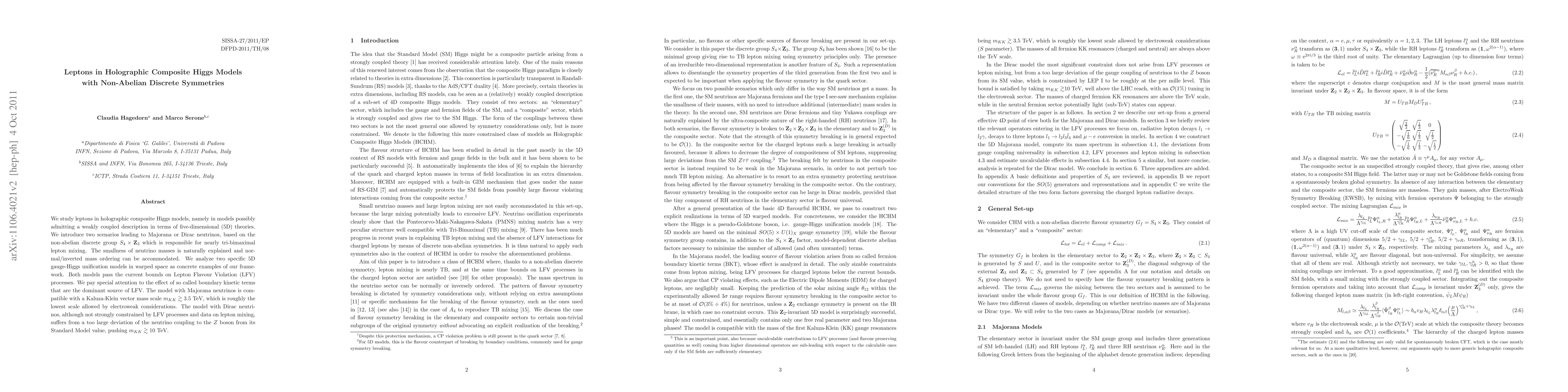 This paper explores leptons in holographic composite Higgs models with non-Abelian discrete symmetries, specifically focusing on scenarios based on the $S_4\times \Z_3$ group that yield Majorana or Dirac neutrinos. It examines two 5D gauge-Higgs models in warped space, highlighting the role of boundary kinetic terms in Lepton Flavour Violation and the implications for the Kaluza-Klein vector mass scale.