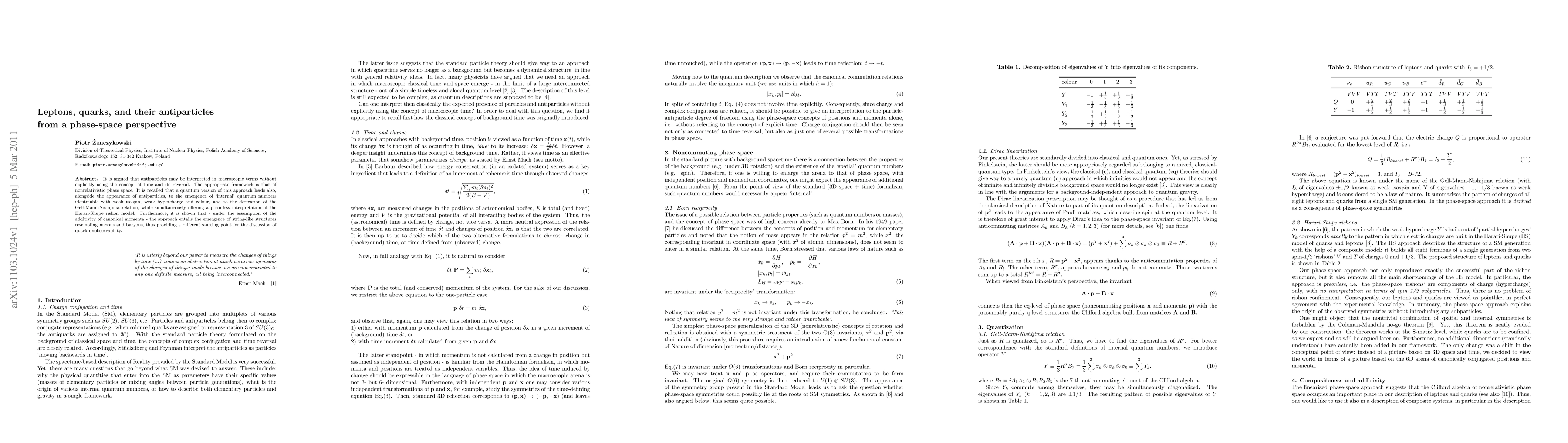 It is argued that antiparticles may be interpreted in macroscopic terms without explicitly using the concept of time and its reversal. The appropriate framework is that of nonrelativistic phase space. It is recalled that a quantum version of this approach leads also, alongside the appearance of antiparticles, to the emergence of `internal' quantum numbers identifiable with weak isospin, weak hypercharge and colour, and to the derivation of the Gell-Mann-Nishijima relation, while simultaneously offering a preonless interpretation of the Harari-Shupe rishon model. Furthermore, it is shown that - under the assumption of the additivity of canonical momenta - the approach entails the emergence of string-like structures resembling mesons and baryons, thus providing a different starting point for the discussion of quark unobservability.
