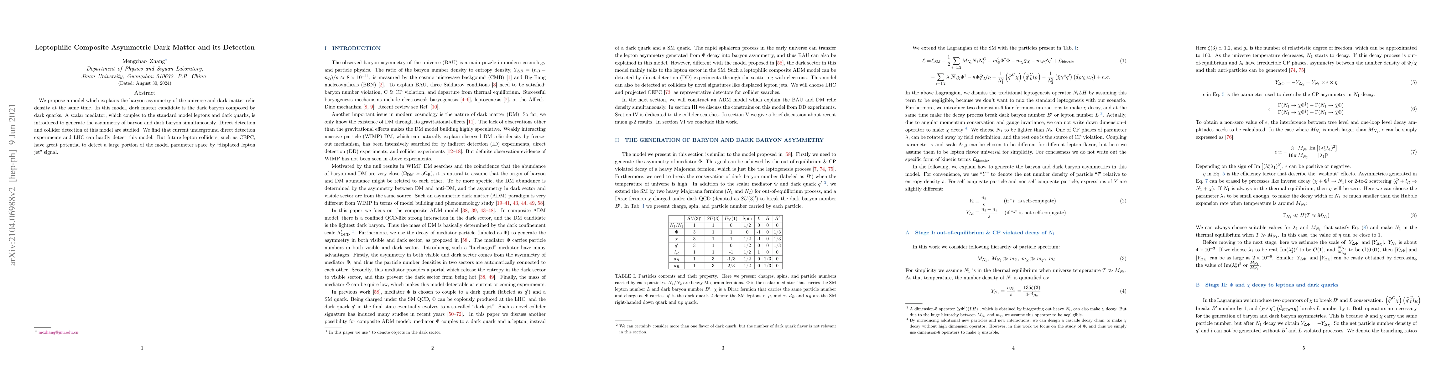 We propose a model which explains the baryon asymmetry of the universe and dark matter relic density at the same time. In this model, dark matter candidate is the dark baryon composed by dark quarks. A scalar mediator, which couples to the standard model leptons and dark quarks, is introduced to generate the asymmetry of baryon and dark baryon simultaneously. Direct detection and collider detection of this model are studied. We find that current underground direct detection experiments and LHC can hardly detect this model. But future lepton colliders, such as CEPC, have great potential to detect a large portion of the model parameter space by "displaced lepton jet" signal.