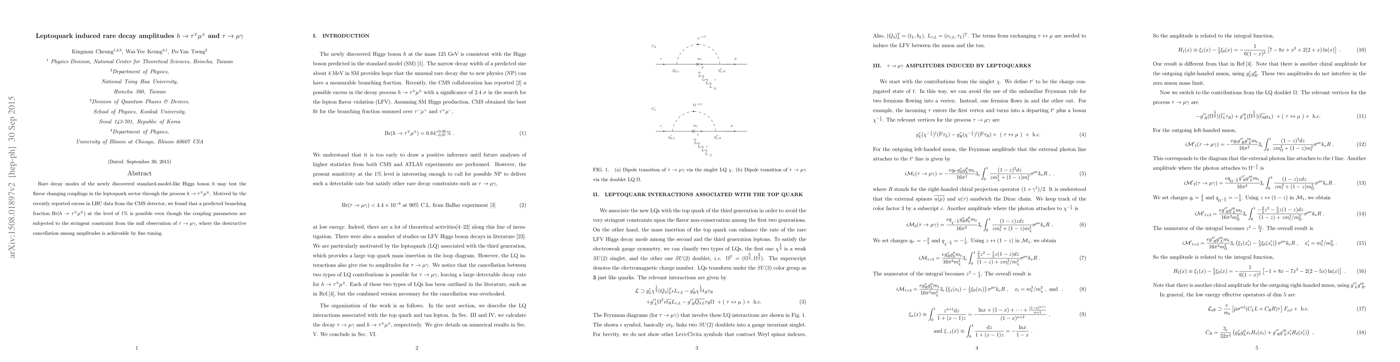 This paper investigates rare decay modes of the Higgs boson $h$ into $\tau^\mp\mu^\pm$ and $\tau\to\mu\gamma$, exploring potential leptoquark-induced flavor-changing processes. It finds that a branching fraction of 1% for $h \to \tau^\mp\mu^\pm$ is feasible despite stringent constraints from $\tau\to\mu\gamma$, through fine-tuned destructive cancellations among decay amplitudes.