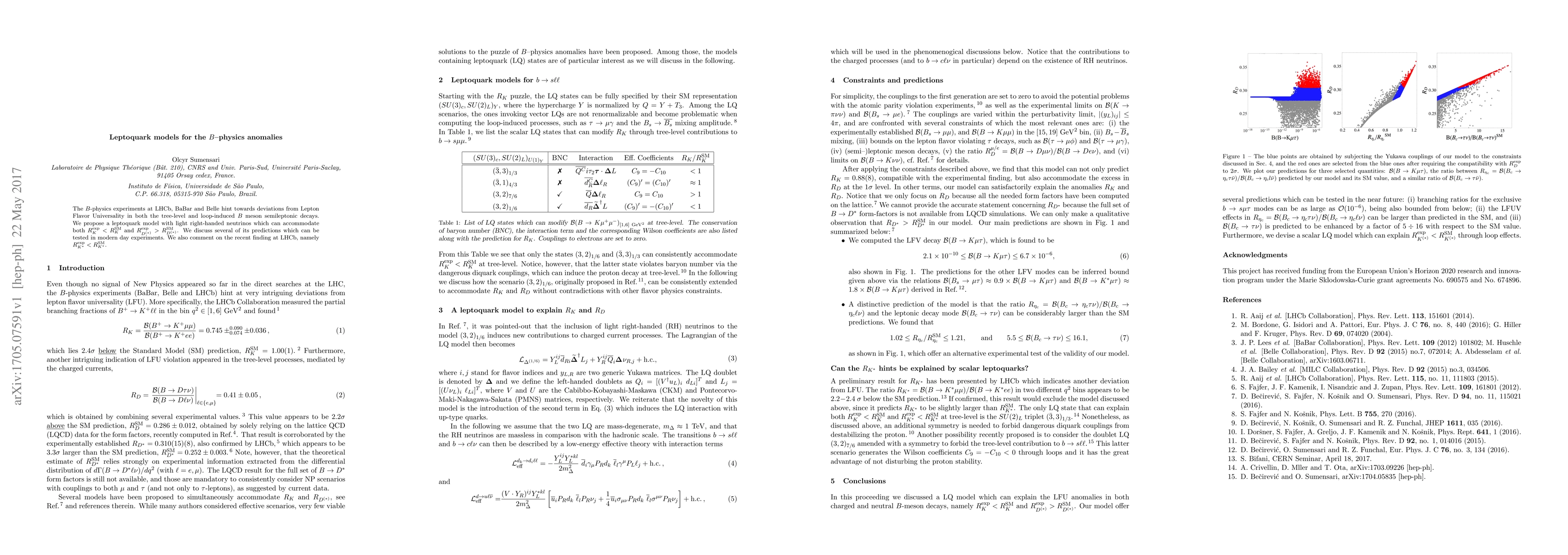 This paper proposes a leptoquark model with light right-handed neutrinos to explain deviations from Lepton Flavor Universality observed in $B$-meson decays at LHCb, BaBar, and Belle. The model addresses both $R_K$ and $R_{D^{(\ast)}}$ anomalies and suggests testable predictions for modern experiments, including the recent $R_{K^\ast}$ finding at LHCb.
