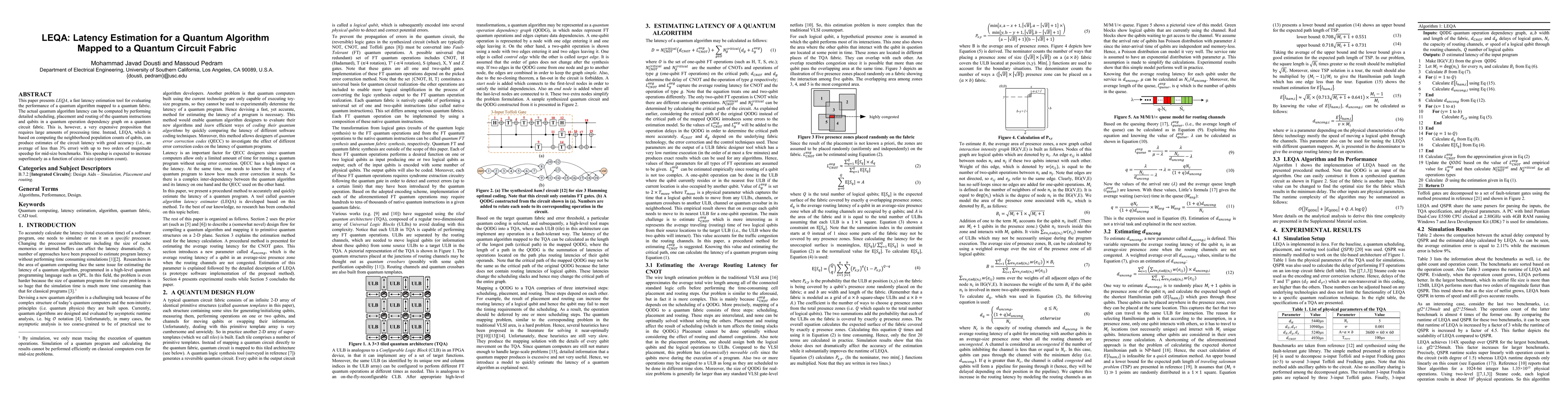 LEQA is a fast tool for estimating the latency of quantum algorithms on quantum circuit fabrics, achieving up to two orders of magnitude speedup compared to detailed scheduling methods, with an average error of less than 3%.
