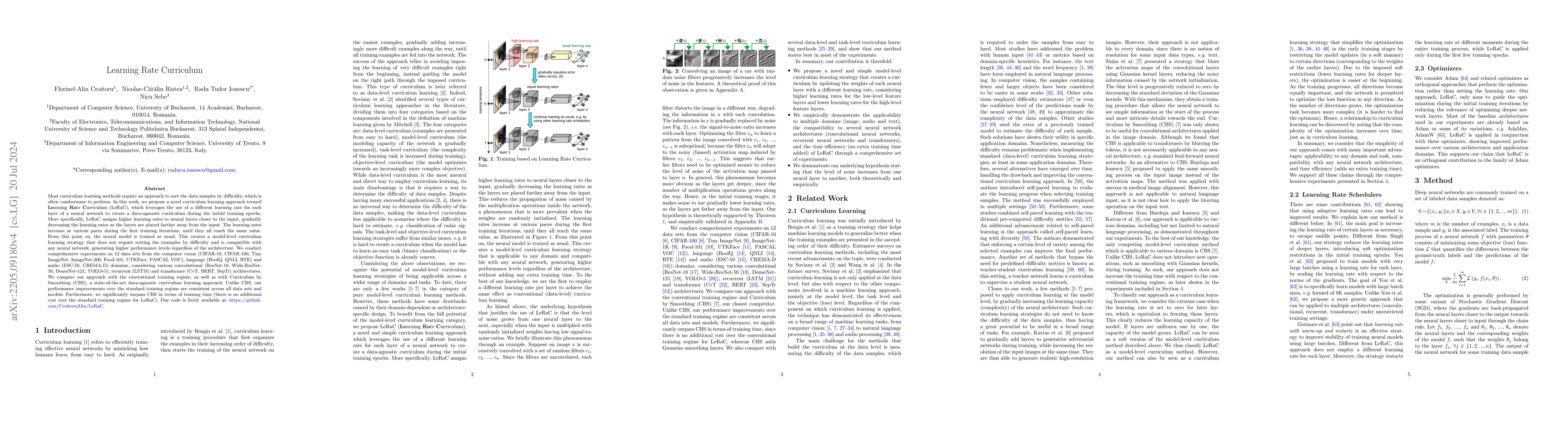 LeRaC proposes a novel curriculum learning method that uses varying learning rates for different neural network layers to create a data-free training curriculum, achieving higher performance without requiring sample difficulty sorting. Experiments show consistent performance improvements across various datasets and neural architectures compared to conventional training and other data-free methods.