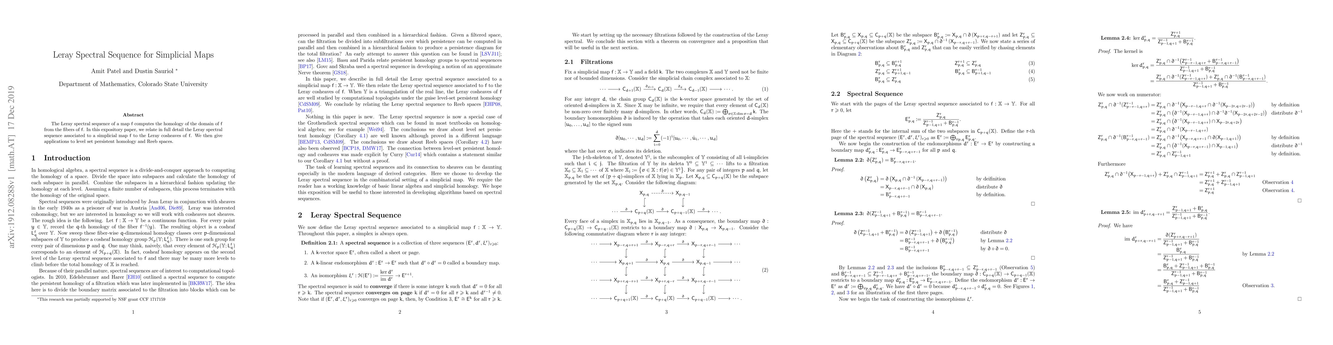 This paper provides a detailed examination of the Leray spectral sequence for simplicial maps, linking it to the Leray cosheaves and applying the method to enhance understanding in level set persistent homology and Reeb spaces.