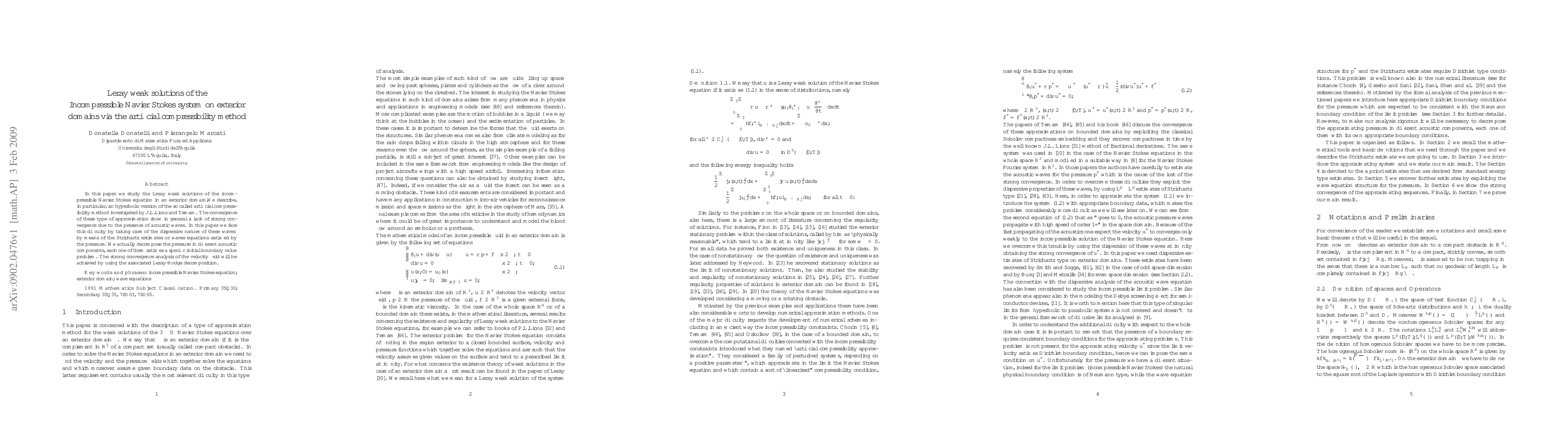 This paper investigates Leray weak solutions of the incompressible Navier-Stokes equation in exterior domains using an artificial compressibility method. It addresses the lack of strong convergence due to acoustic waves by decomposing the pressure into components and employing Strichartz estimates, ultimately achieving strong convergence of the velocity field via Leray-Hodge decomposition.