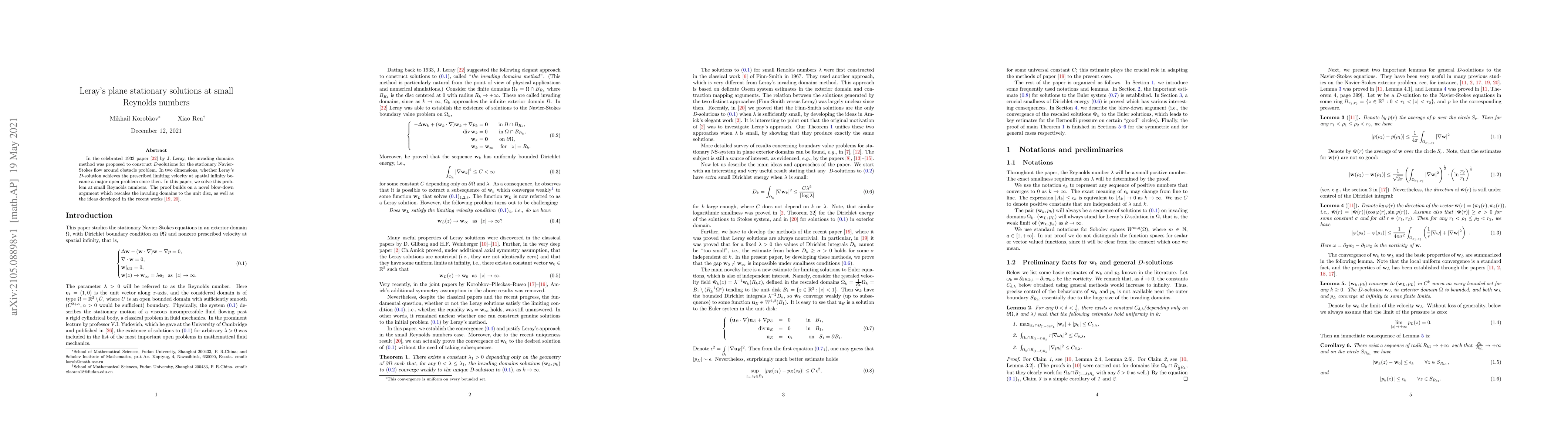 This paper resolves the longstanding open question regarding the behavior of Leray's D-solutions for the stationary Navier-Stokes flow in two dimensions at small Reynolds numbers, proving that they achieve the prescribed limiting velocity at spatial infinity. The proof employs a novel blow-down argument and builds on recent results from related studies.