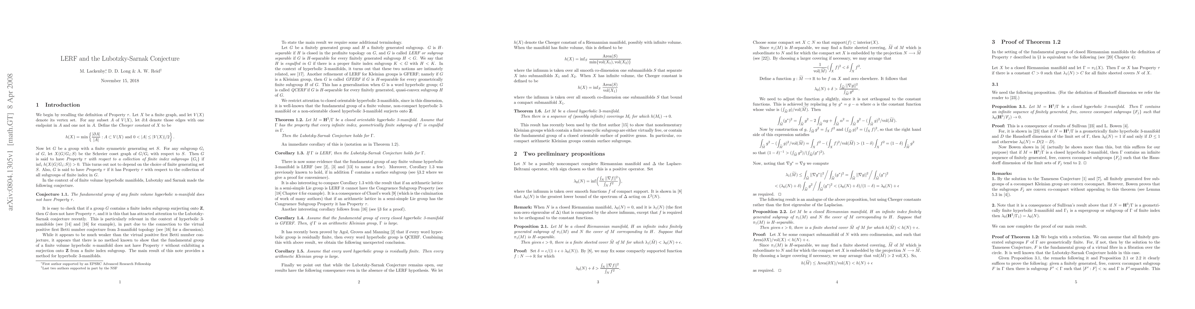Summary: The paper proves that closed hyperbolic 3-manifolds possess a family of coverings where Cheeger constants tend to zero. It further establishes that if the manifold's fundamental group is LERF, it satisfies the Lubotzky-Sarnak conjecture.