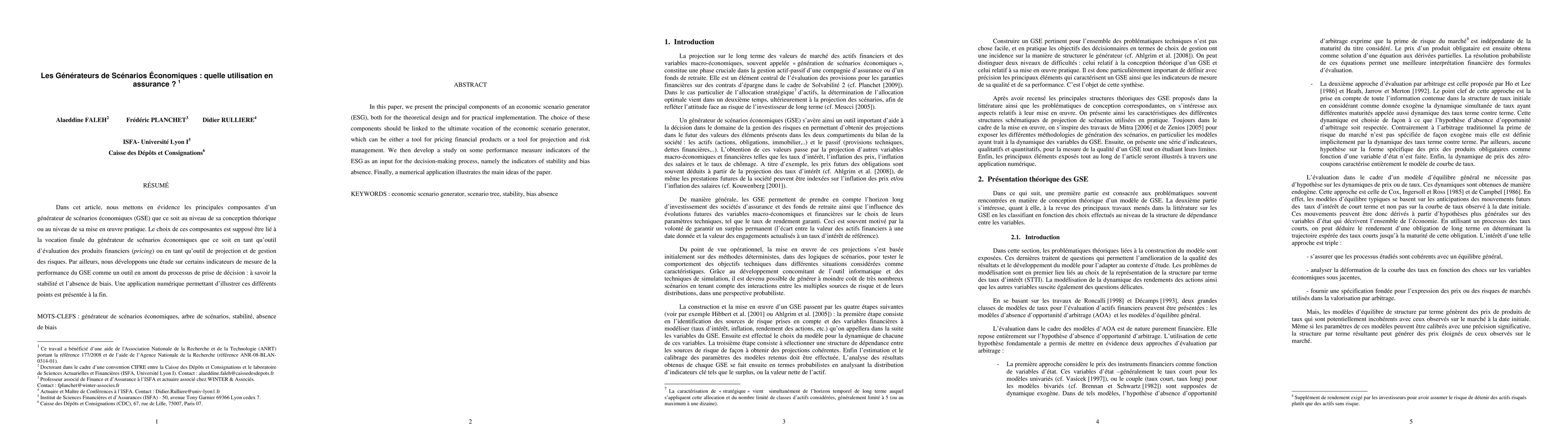 In this paper, we present the principal components of an economic scenario generator (ESG), both for the theoretical design and for practical implementation. The choice of these components should be linked to the ultimate vocation of the economic scenario generator, which can be either a tool for pricing financial products or a tool for projection and risk management. We then develop a study on some performance measure indicators of the ESG as an input for the decision-making process, namely the indicators of stability and bias absence. Finally, a numerical application illustrates the main ideas of the paper.