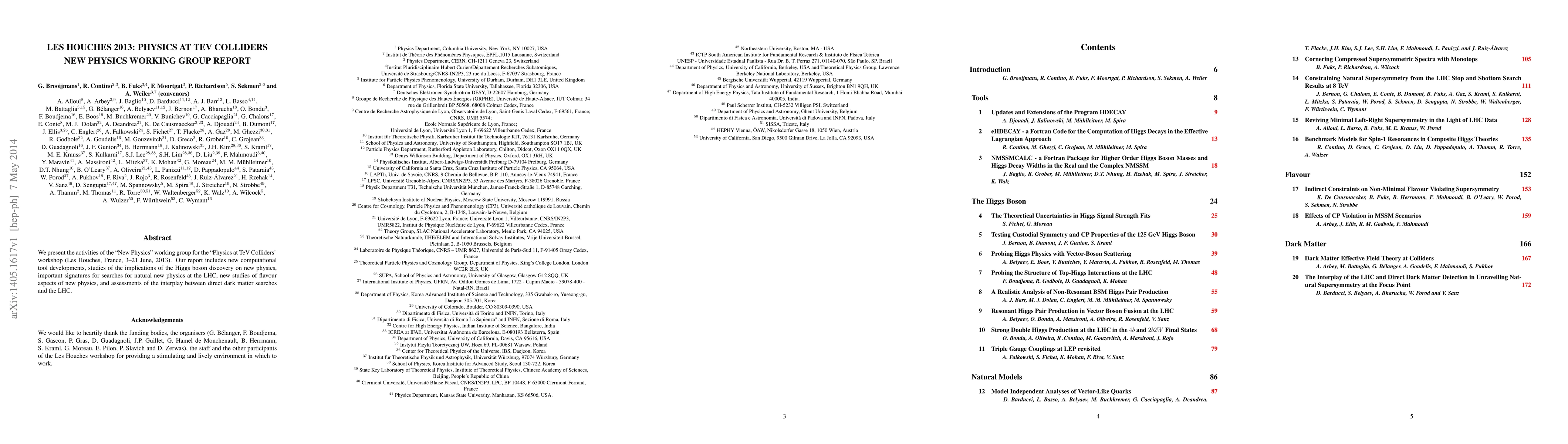 We present the activities of the "New Physics" working group for the "Physics at TeV Colliders" workshop (Les Houches, France, 3--21 June, 2013). Our report includes new computational tool developments, studies of the implications of the Higgs boson discovery on new physics, important signatures for searches for natural new physics at the LHC, new studies of flavour aspects of new physics, and assessments of the interplay between direct dark matter searches and the LHC.