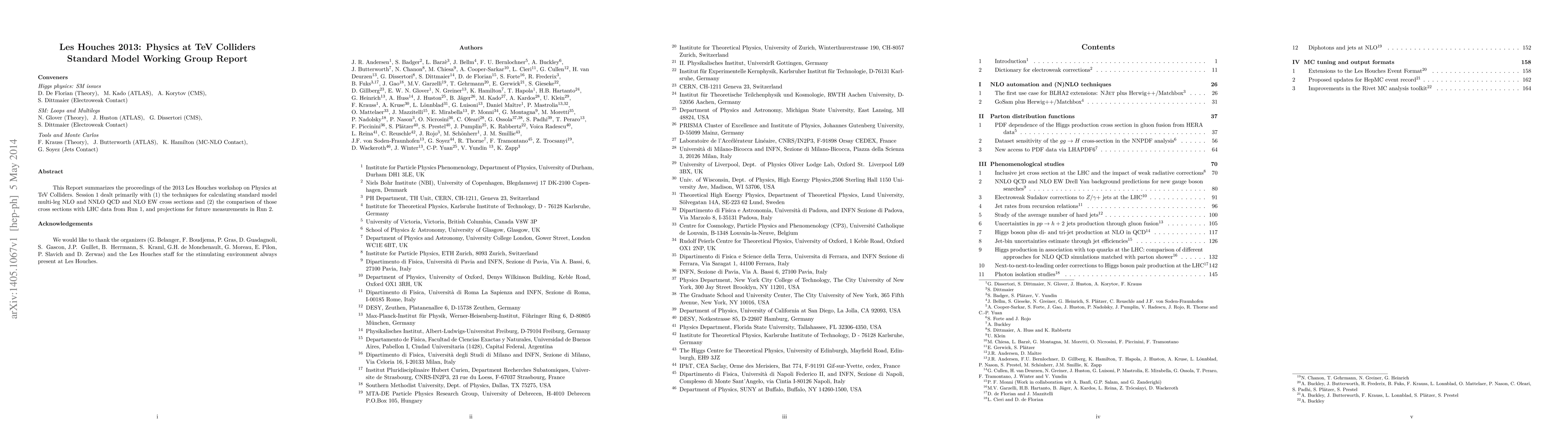 This report summarizes the 2013 Les Houches workshop on Physics at TeV Colliders, focusing on techniques for calculating Standard Model cross sections and comparing them with LHC data from Run 1, along with projections for future measurements in Run 2.