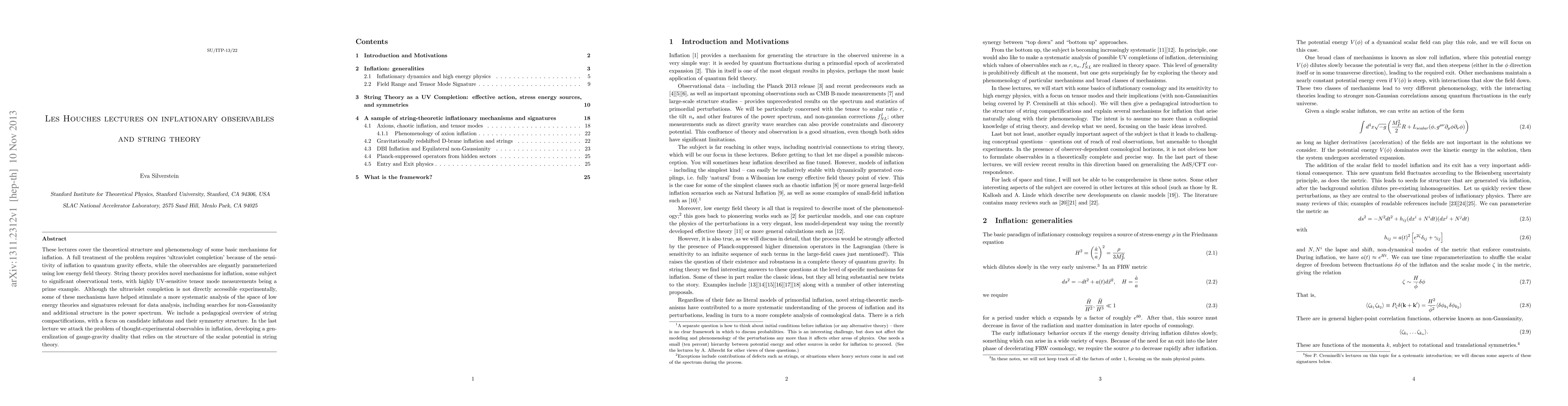 These lectures cover the theoretical structure and phenomenology of some basic mechanisms for inflation. A full treatment of the problem requires `ultraviolet completion' because of the sensitivity of inflation to quantum gravity effects, while the observables are elegantly parameterized using low energy field theory. String theory provides novel mechanisms for inflation, some subject to significant observational tests, with highly UV-sensitive tensor mode measurements being a prime example. Although the ultraviolet completion is not directly accessible experimentally, some of these mechanisms have helped stimulate a more systematic analysis of the space of low energy theories and signatures relevant for data analysis, including searches for non-Gaussianity and additional structure in the power spectrum. We include a pedagogical overview of string compactifications, with a focus on candidate inflatons and their symmetry structure. In the last lecture we attack the problem of thought-experimental observables in inflation, developing a generalization of gauge-gravity duality that relies on the structure of the scalar potential in string theory.