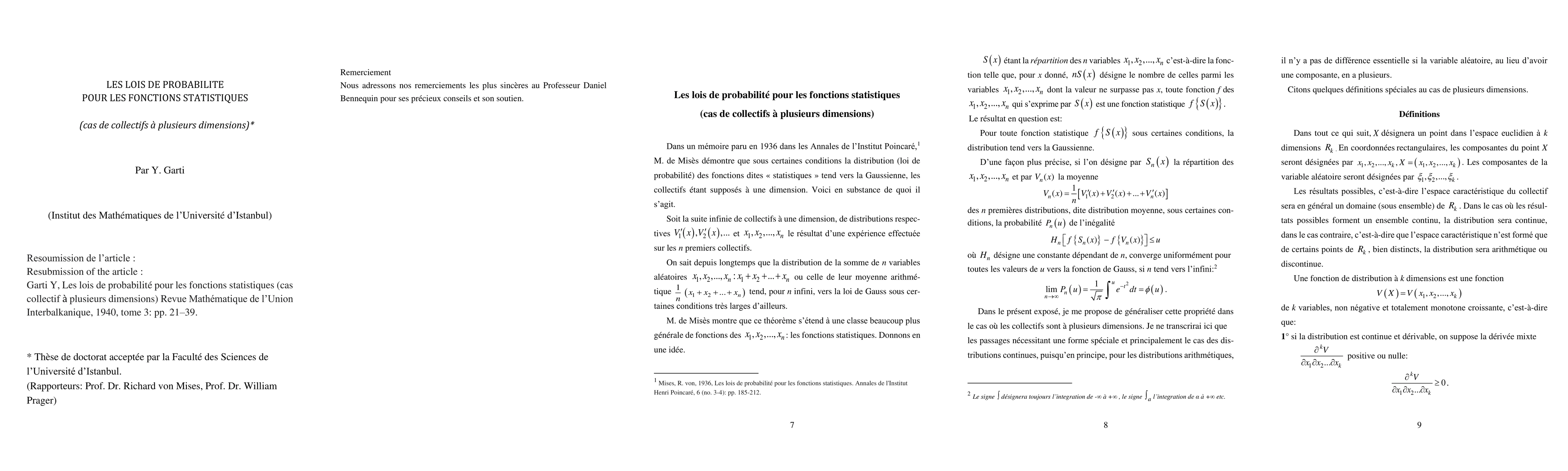 In a memoir published in 1936 in the Annales de Institut Poincare, M. de Mises demonstrates that under certain conditions, the distribution (law of probability) of the so-called statistical functions tends towards the Gaussian, the collectives being assumed to have one dimension. In the present presentation, I propose to generalize this property in the case where the collectives are with several dimensions.