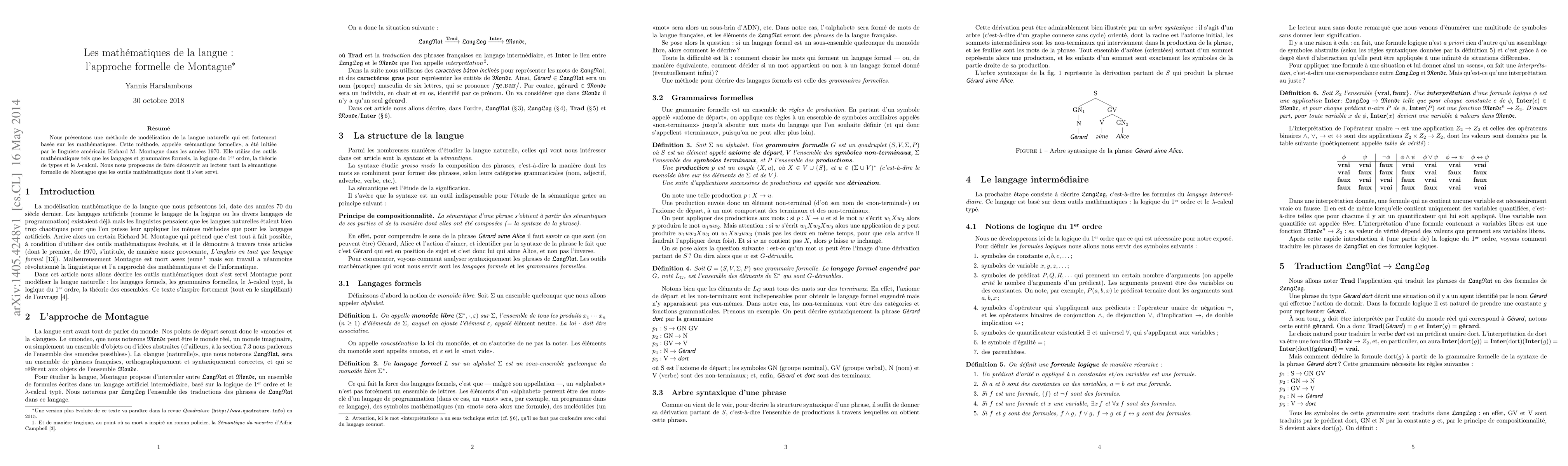 We present a natural language modelization method which is strongely relying on mathematics. This method, called "Formal Semantics," has been initiated by the American linguist Richard M. Montague in the 1970's. It uses mathematical tools such as formal languages and grammars, first-order logic, type theory and $\lambda$-calculus. Our goal is to have the reader discover both Montagovian formal semantics and the mathematical tools that he used in his method. ----- Nous pr\'esentons une m\'ethode de mod\'elisation de la langue naturelle qui est fortement bas\'ee sur les math\'ematiques. Cette m\'ethode, appel\'ee {\guillemotleft}s\'emantique formelle{\guillemotright}, a \'et\'e initi\'ee par le linguiste am\'ericain Richard M. Montague dans les ann\'ees 1970. Elle utilise des outils math\'ematiques tels que les langages et grammaires formels, la logique du 1er ordre, la th\'eorie de types et le $\lambda$-calcul. Nous nous proposons de faire d\'ecouvrir au lecteur tant la s\'emantique formelle de Montague que les outils math\'ematiques dont il s'est servi.