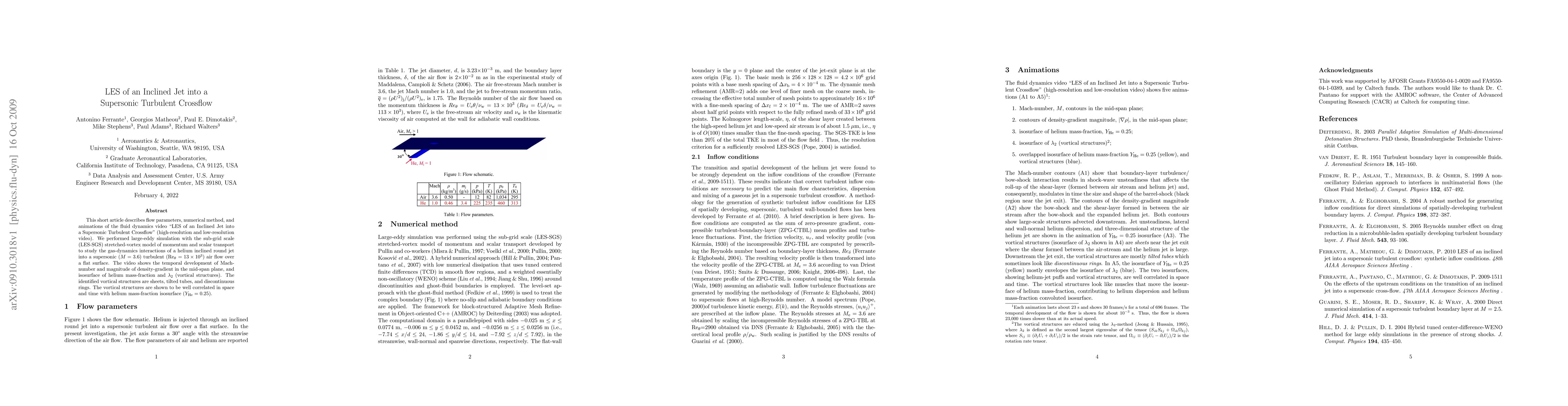 This paper presents a large-eddy simulation (LES) of an inclined helium jet interacting with a supersonic turbulent crossflow, employing the LES-SGS stretched-vortex model. The study reveals the temporal development of Mach number, density gradients, and vortical structures like sheets, tilted tubes, and discontinuous rings.