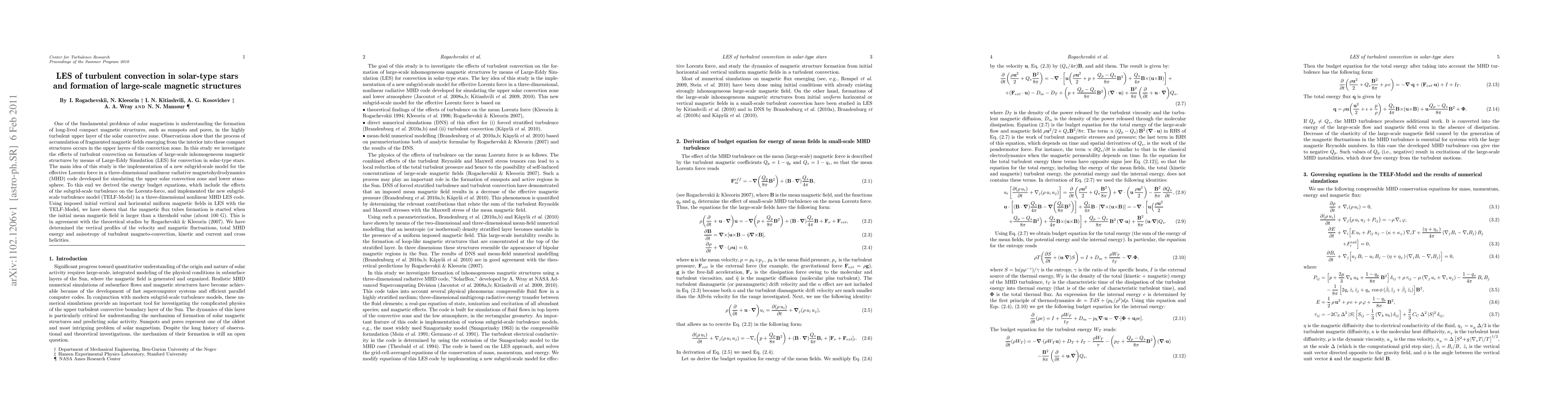 In this study we investigate the effects of turbulent convection on formation of large-scale inhomogeneous magnetic structures by means of Large-Eddy Simulation (LES) for convection in solar-type stars. The main idea of this study is the implementation of a new subgrid-scale model for the effective Lorentz force in a three-dimensional nonlinear radiative magnetohydrodynamics (MHD) code developed for simulating the upper solar convection zone and lower atmosphere. To this end we derived the energy budget equations, which include the effects of the subgrid-scale turbulence on the Lorentz-force, and implemented the new subgrid-scale turbulence model (TELF-Model) in a three-dimensional nonlinear MHD LES code. Using imposed initial vertical and horizontal uniform magnetic fields in LES with the TELF-Model, we have shown that the magnetic flux tubes formation is started when the initial mean magnetic field is larger than a threshold value (about 100 G). This is in agreement with the theoretical studies by Rogachevskii and Kleeorin (2007). We have determined the vertical profiles of the velocity and magnetic fluctuations, total MHD energy and anisotropy of turbulent magneto-convection, kinetic and current and cross helicities.