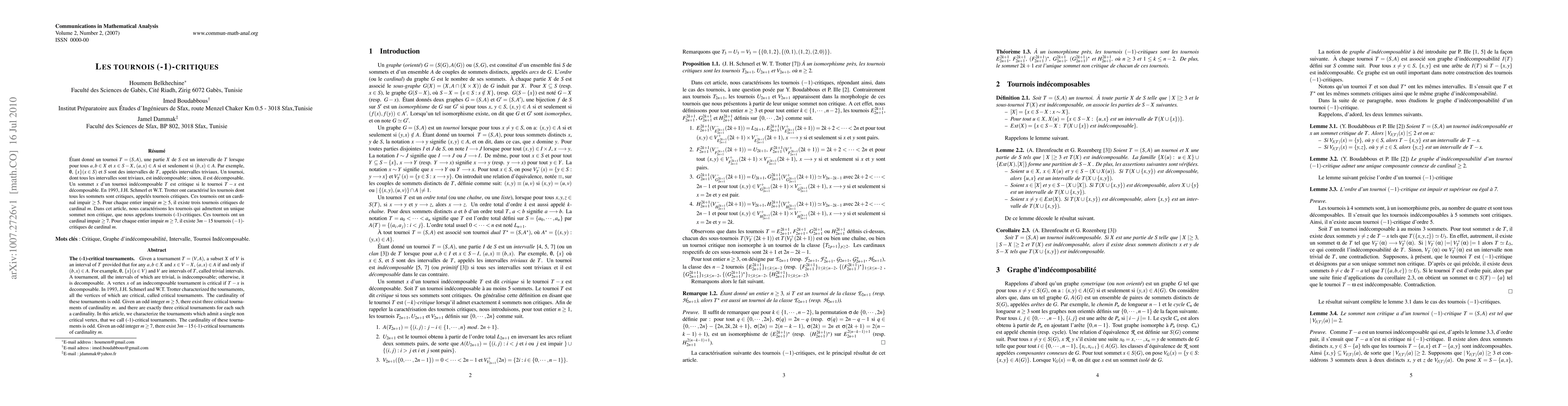 Given a tournament T=(V,A), a subset X of V is an interval of T provided that for any a, b\in X and x\in V-X, (a,x) \in A if and only if (b,x)\in A. For example, \emptyset, \{x\} (x\in V) and V are intervals of T, called trivial intervals. A tournament, all the intervals of which are trivial, is indecomposable; otherwise, it is decomposable. A vertex x of an indecomposable tournament is critical if T-x is decomposable. In 1993, J.H. Schmerl and W.T. Trotter characterized the tournaments, all the vertices of which are critical, called critical tournaments. The cardinality of these tournaments is odd. Given an odd integer m \geq 5, there exist three critical tournaments of cardinality . and there are exactly three critical tournaments for each such a cardinality. In this article, we characterize the tournaments which admit a single non critical vertex, that we call (-1)-critical tournaments. The cardinality of these tournaments is odd. Given an odd integer m \geq 7, there exist 3m-15 (-1)-critical tournaments of cardinality m.