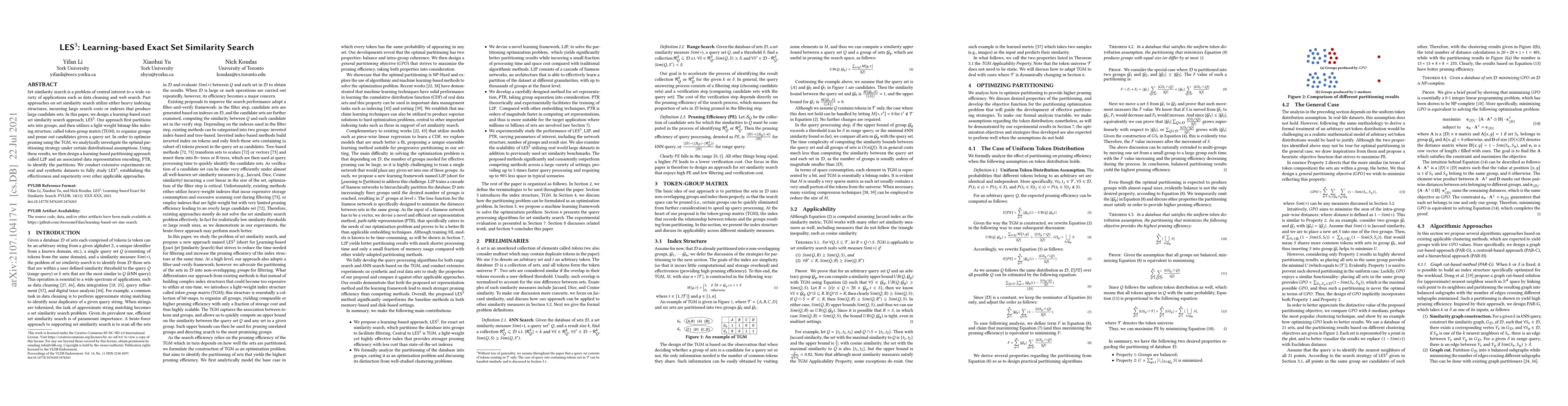 This paper introduces LES3, a learning-based exact set similarity search method that partitions sets into groups and employs a token-group matrix for efficient candidate pruning. The authors propose L2P and PTR for optimal partitioning and data representation, demonstrating superior performance over other methods through extensive experiments.
