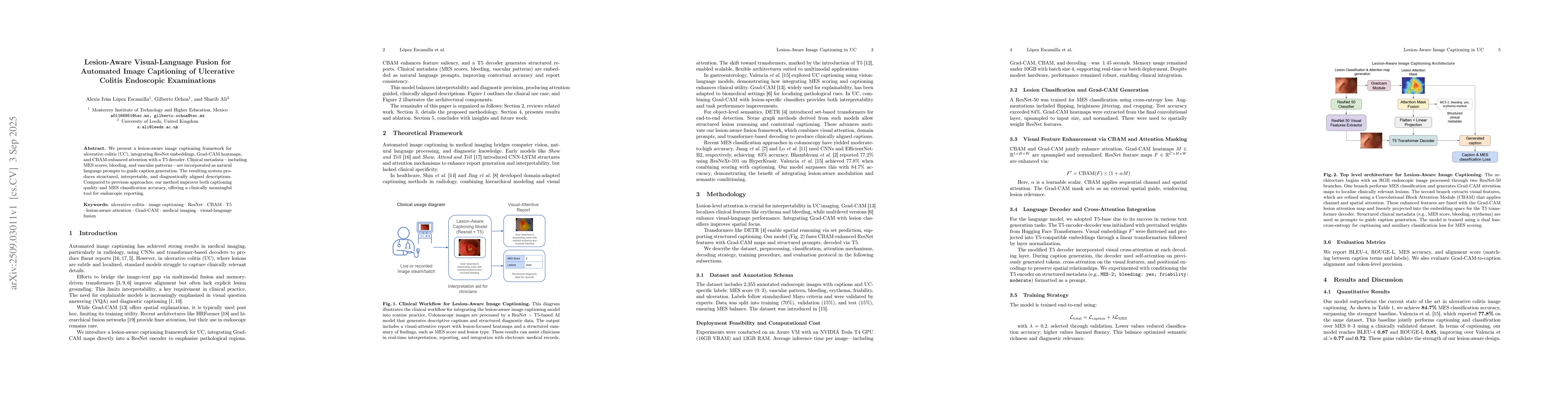 We present a lesion-aware image captioning framework for ulcerative colitis (UC). The model integrates ResNet embeddings, Grad-CAM heatmaps, and CBAM-enhanced attention with a T5 decoder. Clinical metadata (MES score 0-3, vascular pattern, bleeding, erythema, friability, ulceration) is injected as natural-language prompts to guide caption generation. The system produces structured, interpretable descriptions aligned with clinical practice and provides MES classification and lesion tags. Compared with baselines, our approach improves caption quality and MES classification accuracy, supporting reliable endoscopic reporting.