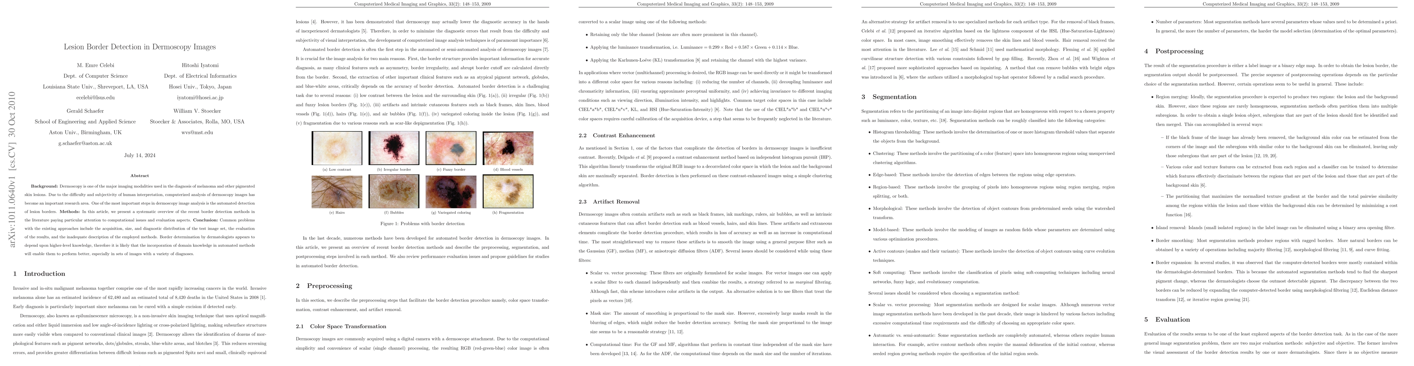 This paper reviews recent methods for detecting lesion borders in dermoscopy images, highlighting computational challenges and evaluation issues. It concludes that incorporating domain knowledge into automated methods could improve performance, especially for diverse diagnostic sets.