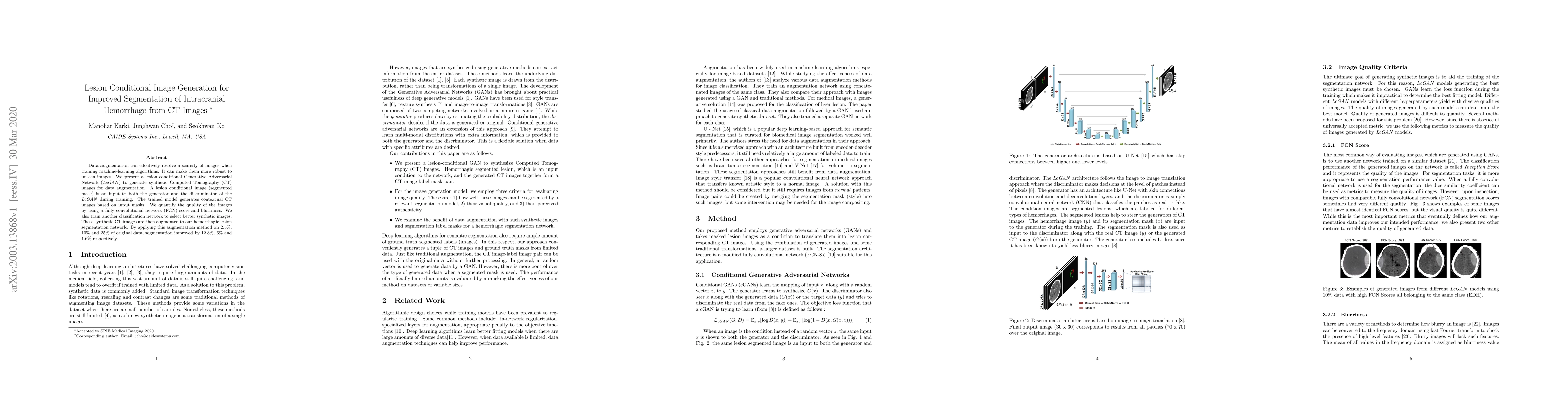 Data augmentation can effectively resolve a scarcity of images when training machine-learning algorithms. It can make them more robust to unseen images. We present a lesion conditional Generative Adversarial Network LcGAN to generate synthetic Computed Tomography (CT) images for data augmentation. A lesion conditional image (segmented mask) is an input to both the generator and the discriminator of the LcGAN during training. The trained model generates contextual CT images based on input masks. We quantify the quality of the images by using a fully convolutional network (FCN) score and blurriness. We also train another classification network to select better synthetic images. These synthetic CT images are then augmented to our hemorrhagic lesion segmentation network. By applying this augmentation method on 2.5%, 10% and 25% of original data, segmentation improved by 12.8%, 6% and 1.6% respectively.