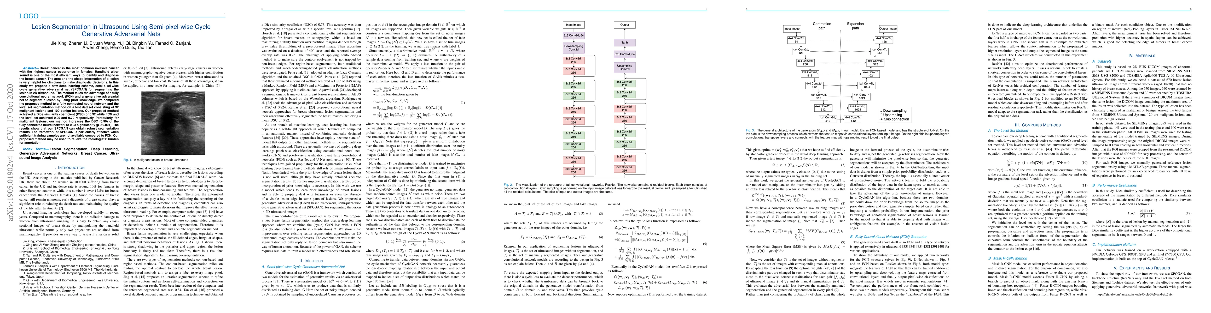 A new deep-learning scheme called semi-pixel-wise cycle generative adversarial net (SPCGAN) is proposed for segmenting lesions in 2D ultrasound images, achieving a Dice similarity coefficient of 0.92.