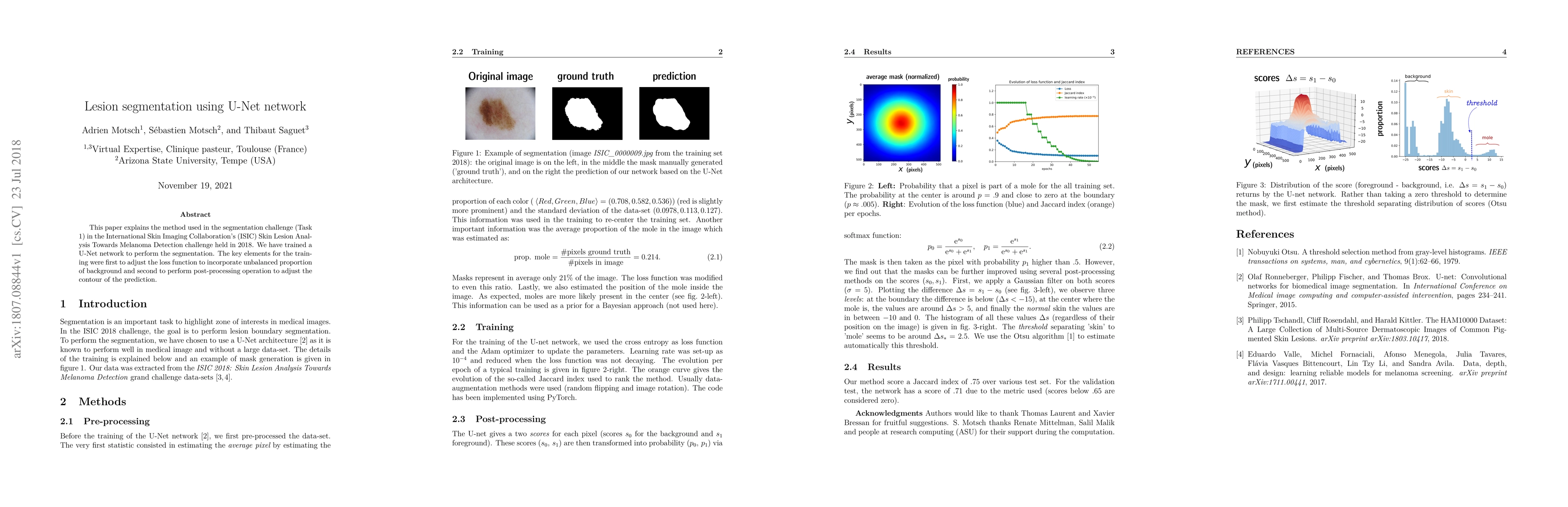 This paper details a U-Net network trained for segmenting skin lesions in the 2018 ISIC melanoma detection challenge, emphasizing loss function adjustment for imbalanced data and post-processing for contour refinement.