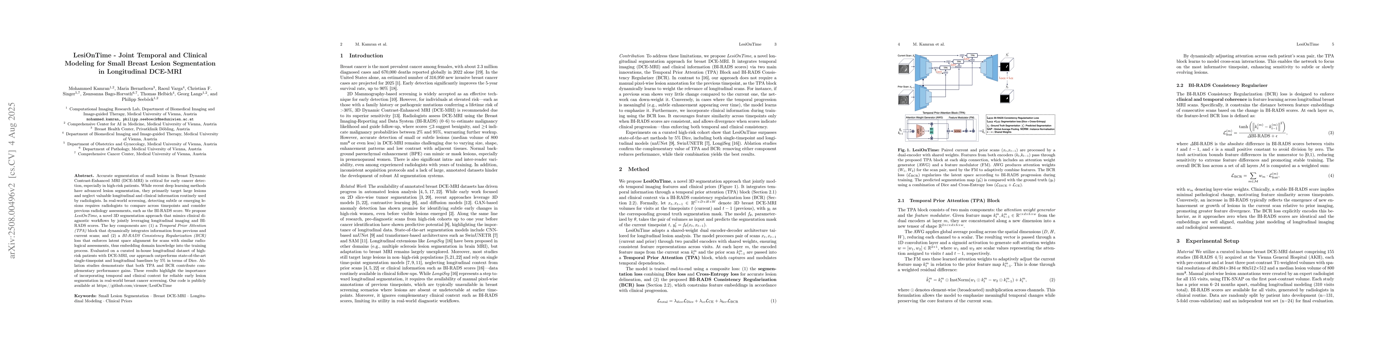 Accurate segmentation of small lesions in Breast Dynamic Contrast-Enhanced MRI (DCE-MRI) is critical for early cancer detection, especially in high-risk patients. While recent deep learning methods have advanced lesion segmentation, they primarily target large lesions and neglect valuable longitudinal and clinical information routinely used by radiologists. In real-world screening, detecting subtle or emerging lesions requires radiologists to compare across timepoints and consider previous radiology assessments, such as the BI-RADS score. We propose LesiOnTime, a novel 3D segmentation approach that mimics clinical diagnostic workflows by jointly leveraging longitudinal imaging and BIRADS scores. The key components are: (1) a Temporal Prior Attention (TPA) block that dynamically integrates information from previous and current scans; and (2) a BI-RADS Consistency Regularization (BCR) loss that enforces latent space alignment for scans with similar radiological assessments, thus embedding domain knowledge into the training process. Evaluated on a curated in-house longitudinal dataset of high-risk patients with DCE-MRI, our approach outperforms state-of-the-art single-timepoint and longitudinal baselines by 5% in terms of Dice. Ablation studies demonstrate that both TPA and BCR contribute complementary performance gains. These results highlight the importance of incorporating temporal and clinical context for reliable early lesion segmentation in real-world breast cancer screening. Our code is publicly available at https://github.com/cirmuw/LesiOnTime