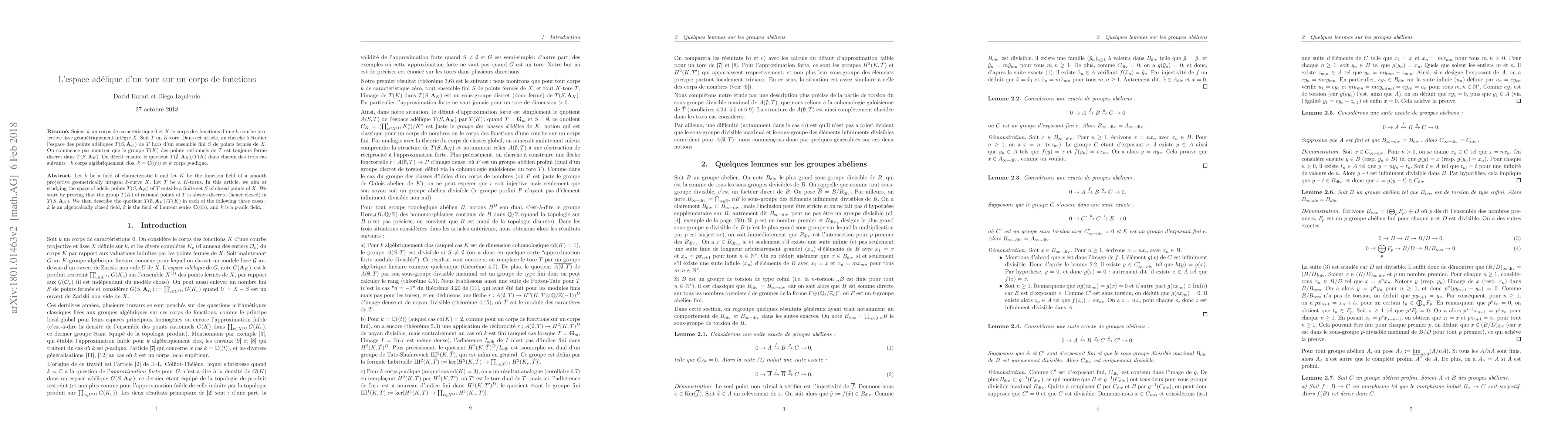 Let $k$ be a field of characteristic 0 and let $K$ be the function field of a smooth projective geometrically integral $k$-curve $X$. Let $T$ be a $K$-torus. In this article, we aim at studying the space of adelic points $T(S,\mathbb{A}_K)$ of $T$ outside a finite set $S$ of closed points of $X$. We start by proving that the group $T(K)$ of rational points of $T$ is always discrete (hence closed) in $T(S,\mathbb{A}_K)$. We then describe the quotient $T(\emptyset,\mathbb{A}_K)/T(K)$ in each of the following three cases: $k$ is an algebraically closed field, $k$ is the field of Laurent series $\mathbb{C}((t))$, and $k$ is a $p$-adic field. Soient $k$ un corps de caract\'eristique 0 et $K$ le corps des fonctions d'une $k$-courbe projective lisse g\'eom\'etriquement int\`egre $X$. Soit $T$ un $K$-tore. Dans cet article, on cherche \`a \'etudier l'espace des points ad\'eliques $T(S,\mathbb{A}_K)$ de $T$ hors d'un ensemble fini $S$ de points ferm\'es de $X$. On commence par montrer que le groupe $T(K)$ des points rationnels de $T$ est toujours ferm\'e discret dans $T(S,\mathbb{A}_K)$. On d\'ecrit ensuite le quotient $T(\emptyset,\mathbb{A}_K)/T(K)$ dans chacun des trois cas suivants: $k$ corps alg\'ebriquement clos, $k=\mathbb{C}((t))$ et $k$ corps $p$-adique.