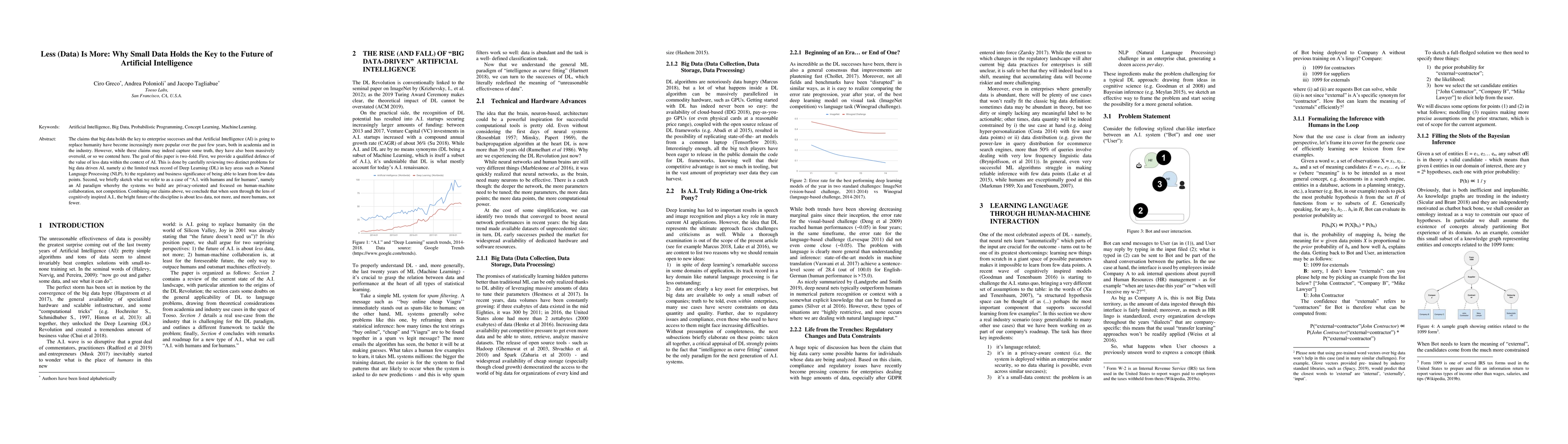 The paper argues that the future of AI lies in 'less data' rather than 'big data', challenging the popular belief that more data leads to better AI. It highlights two main issues with big data-driven AI: its limited success in areas like Natural Language Processing and the importance of learning from few data points for regulatory and business reasons. The authors also propose an AI paradigm focused on human-machine collaboration, emphasizing privacy and human involvement, not replacement.
