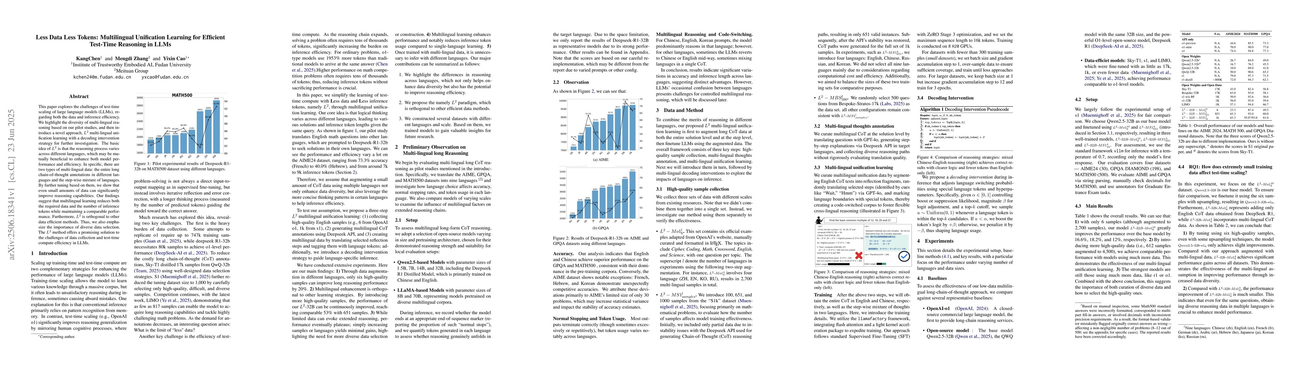 This paper explores the challenges of test-time scaling of large language models (LLMs), regarding both the data and inference efficiency. We highlight the diversity of multi-lingual reasoning based on our pilot studies, and then introduce a novel approach, \(L^2\) multi-lingual unification learning with a decoding intervention strategy for further investigation. The basic idea of \(L^2\) is that the reasoning process varies across different languages, which may be mutually beneficial to enhance both model performance and efficiency. In specific, there are two types of multi-lingual data: the entire long chain-of-thought annotations in different languages and the step-wise mixture of languages. By further tuning based on them, we show that even small amounts of data can significantly improve reasoning capabilities. Our findings suggest that multilingual learning reduces both the required data and the number of inference tokens while maintaining a comparable performance. Furthermore, \(L^2\) is orthogonal to other data efficient methods. Thus, we also emphasize the importance of diverse data selection. The \(L^2\) method offers a promising solution to the challenges of data collection and test-time compute efficiency in LLMs.