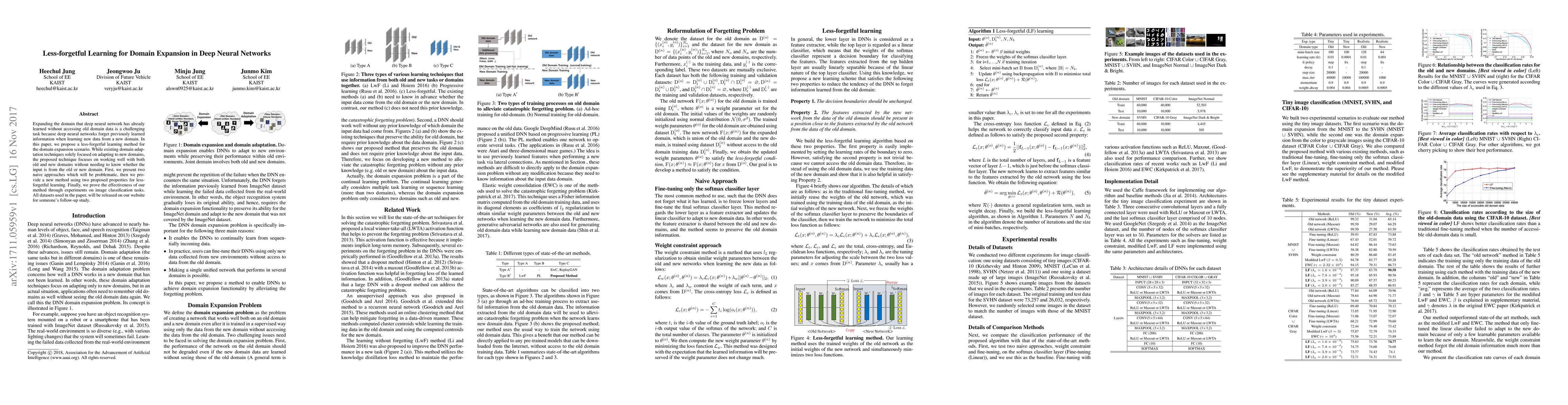 Expanding the domain that deep neural network has already learned without accessing old domain data is a challenging task because deep neural networks forget previously learned information when learning new data from a new domain. In this paper, we propose a less-forgetful learning method for the domain expansion scenario. While existing domain adaptation techniques solely focused on adapting to new domains, the proposed technique focuses on working well with both old and new domains without needing to know whether the input is from the old or new domain. First, we present two naive approaches which will be problematic, then we provide a new method using two proposed properties for less-forgetful learning. Finally, we prove the effectiveness of our method through experiments on image classification tasks. All datasets used in the paper, will be released on our website for someone's follow-up study.