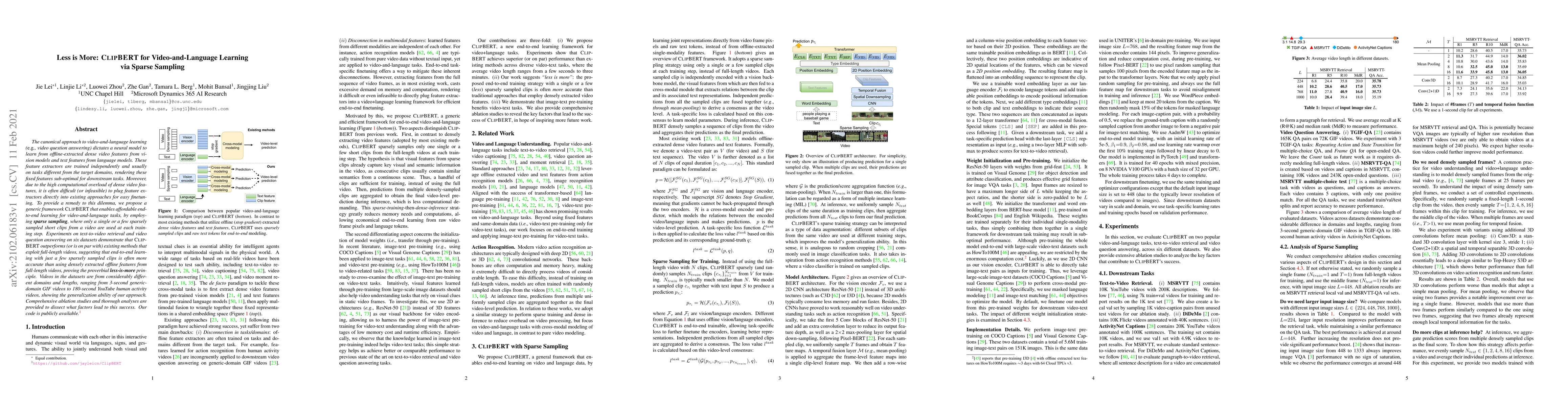 The canonical approach to video-and-language learning (e.g., video question answering) dictates a neural model to learn from offline-extracted dense video features from vision models and text features from language models. These feature extractors are trained independently and usually on tasks different from the target domains, rendering these fixed features sub-optimal for downstream tasks. Moreover, due to the high computational overload of dense video features, it is often difficult (or infeasible) to plug feature extractors directly into existing approaches for easy finetuning. To provide a remedy to this dilemma, we propose a generic framework ClipBERT that enables affordable end-to-end learning for video-and-language tasks, by employing sparse sampling, where only a single or a few sparsely sampled short clips from a video are used at each training step. Experiments on text-to-video retrieval and video question answering on six datasets demonstrate that ClipBERT outperforms (or is on par with) existing methods that exploit full-length videos, suggesting that end-to-end learning with just a few sparsely sampled clips is often more accurate than using densely extracted offline features from full-length videos, proving the proverbial less-is-more principle. Videos in the datasets are from considerably different domains and lengths, ranging from 3-second generic domain GIF videos to 180-second YouTube human activity videos, showing the generalization ability of our approach. Comprehensive ablation studies and thorough analyses are provided to dissect what factors lead to this success. Our code is publicly available at https://github.com/jayleicn/ClipBERT