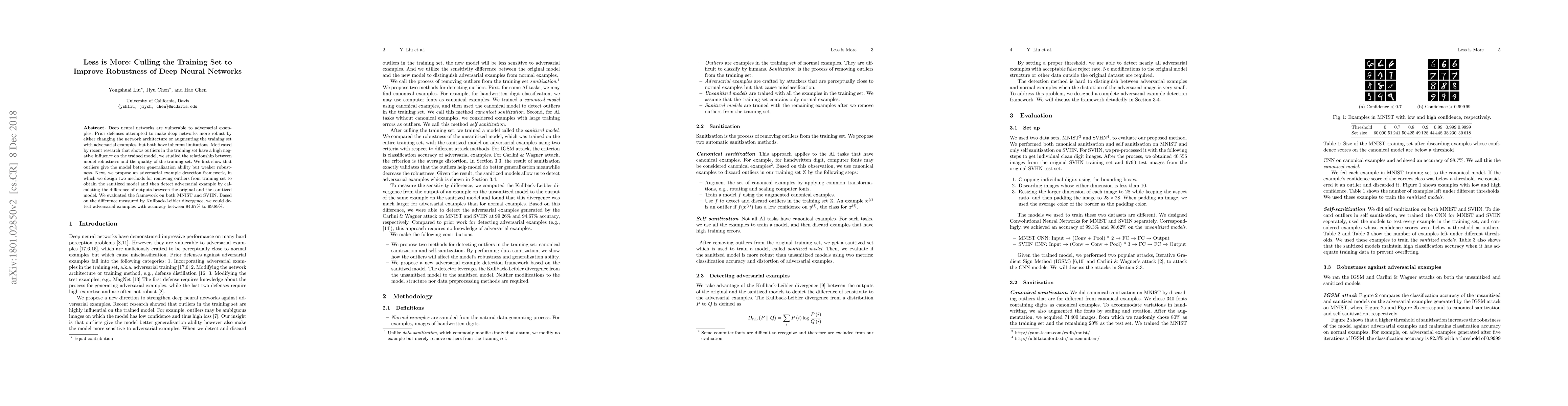 A study found that removing outliers from a deep neural network's training set can improve its robustness to adversarial examples. This approach resulted in detection accuracy of 94.67% to 99.89% on MNIST and SVHN datasets.
