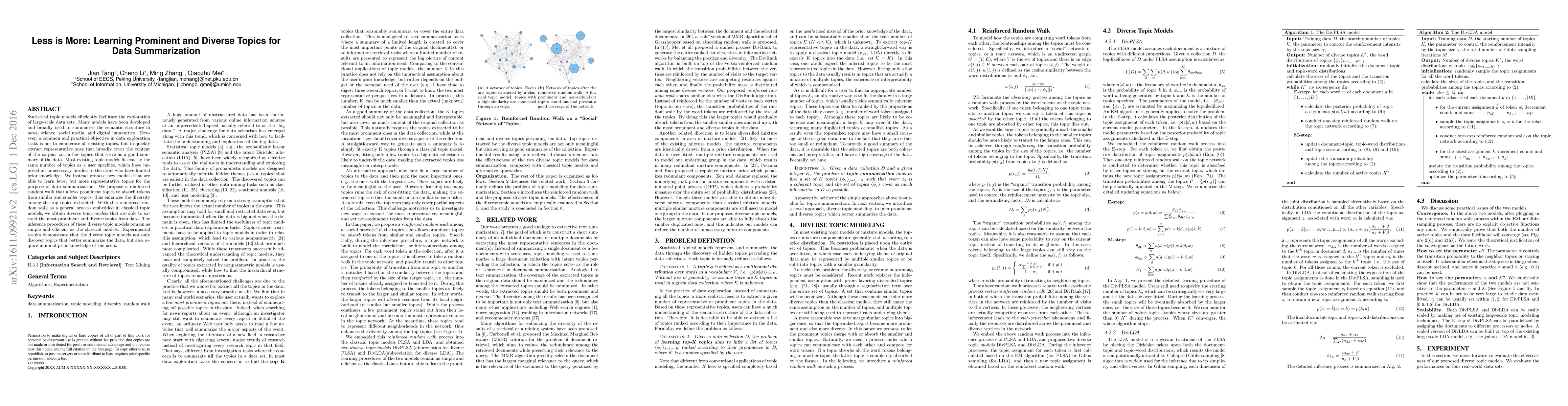 This paper proposes new statistical topic models that learn fewer but more representative topics to efficiently summarize large datasets. By incorporating a reinforced random walk, the models extract prominent and diverse topics, requiring minimal prior knowledge from users while maintaining efficient inference procedures.