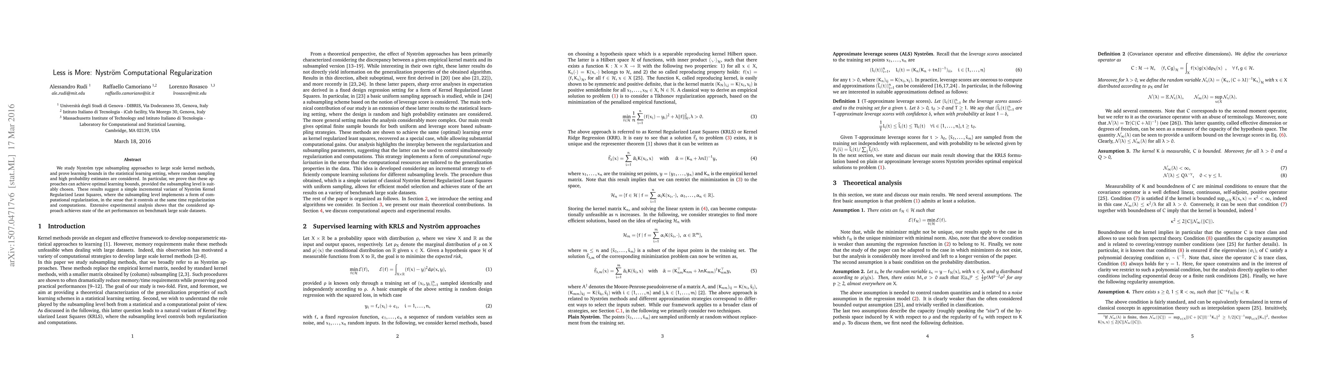 This paper investigates Nyström subsampling methods for large-scale kernel learning, demonstrating that optimal learning bounds can be achieved with appropriate subsampling levels. Experimental results show state-of-the-art performance on large datasets, highlighting the method's computational regularization benefits.