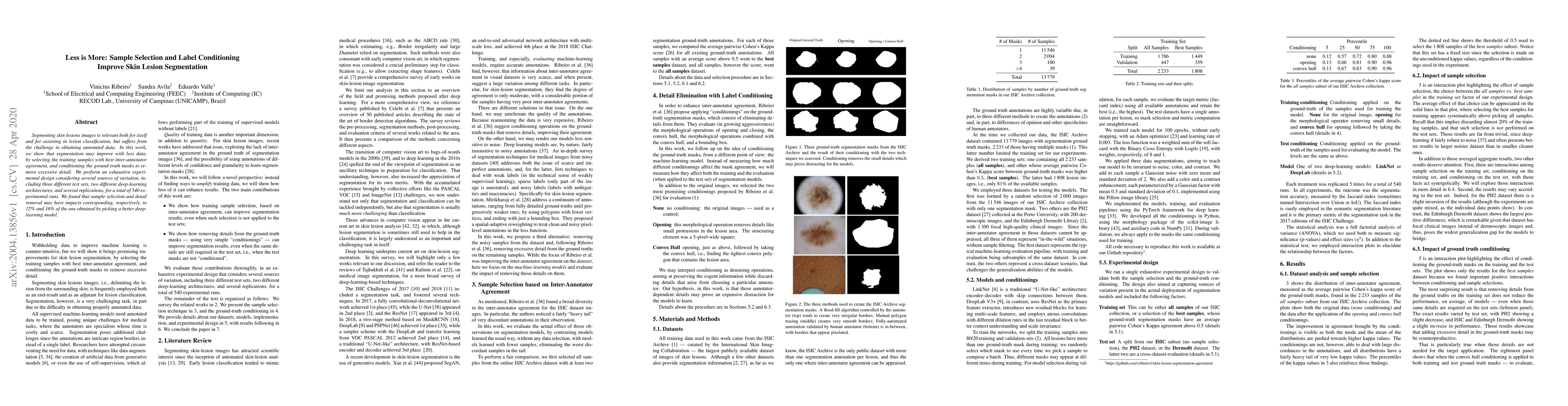 Segmenting skin lesions images is relevant both for itself and for assisting in lesion classification, but suffers from the challenge in obtaining annotated data. In this work, we show that segmentation may improve with less data, by selecting the training samples with best inter-annotator agreement, and conditioning the ground-truth masks to remove excessive detail. We perform an exhaustive experimental design considering several sources of variation, including three different test sets, two different deep-learning architectures, and several replications, for a total of 540 experimental runs. We found that sample selection and detail removal may have impacts corresponding, respectively, to 12% and 16% of the one obtained by picking a better deep-learning model.