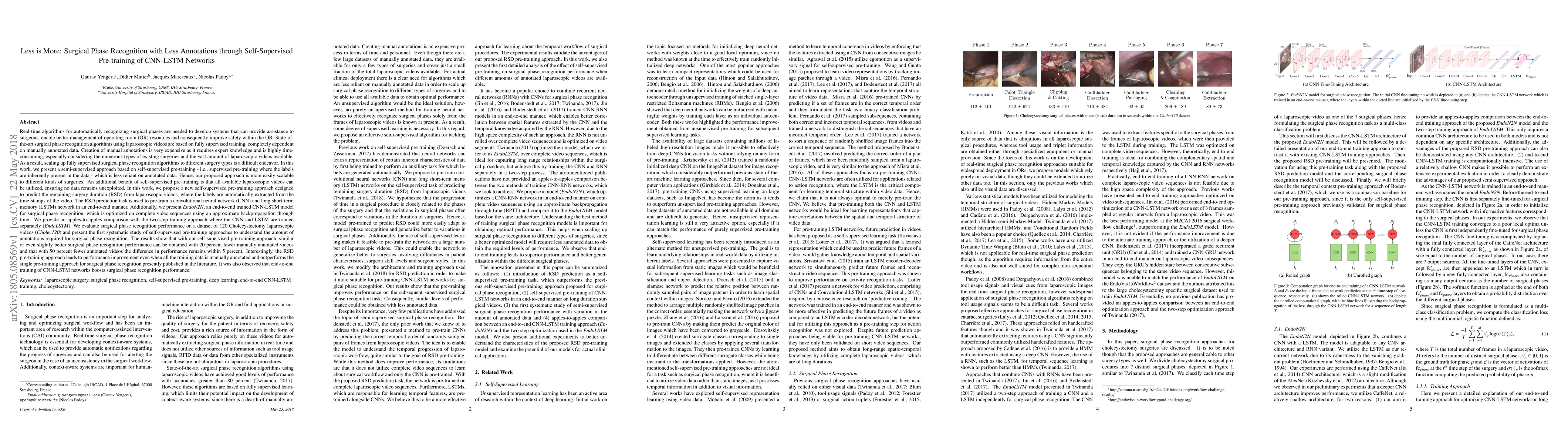 This paper proposes a self-supervised pre-training method using remaining surgery duration prediction to reduce annotation needs for surgical phase recognition in laparoscopic videos. The approach enhances CNN-LSTM networks and outperforms existing supervised methods, even when fully annotated, demonstrating scalability and improved performance in surgical phase detection.
