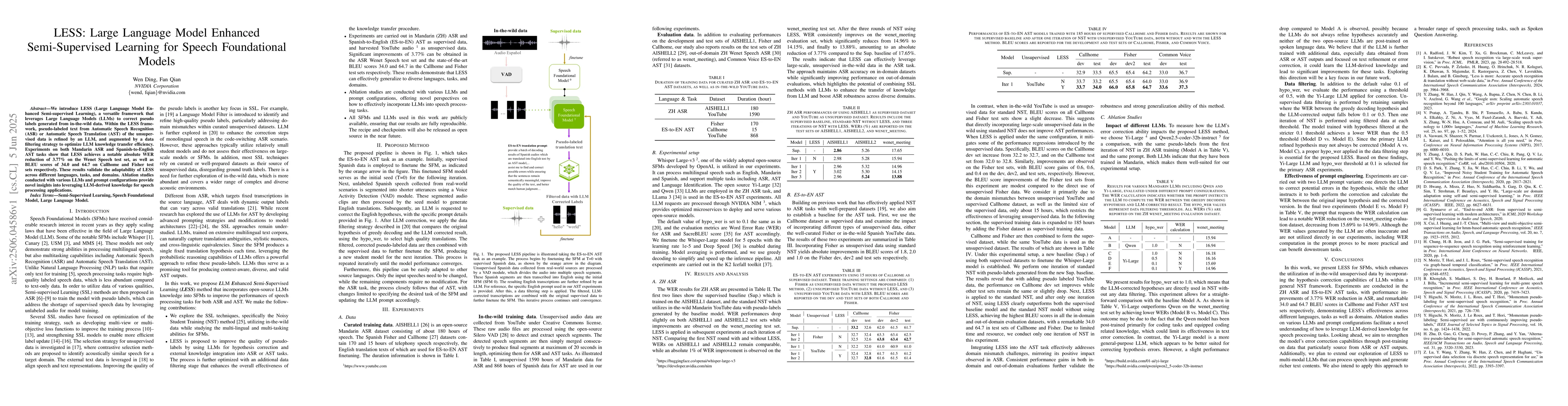This research introduces LESS, a framework that uses large language models to improve semi-supervised learning for speech recognition, achieving significant reductions in error rates across different languages and tasks.