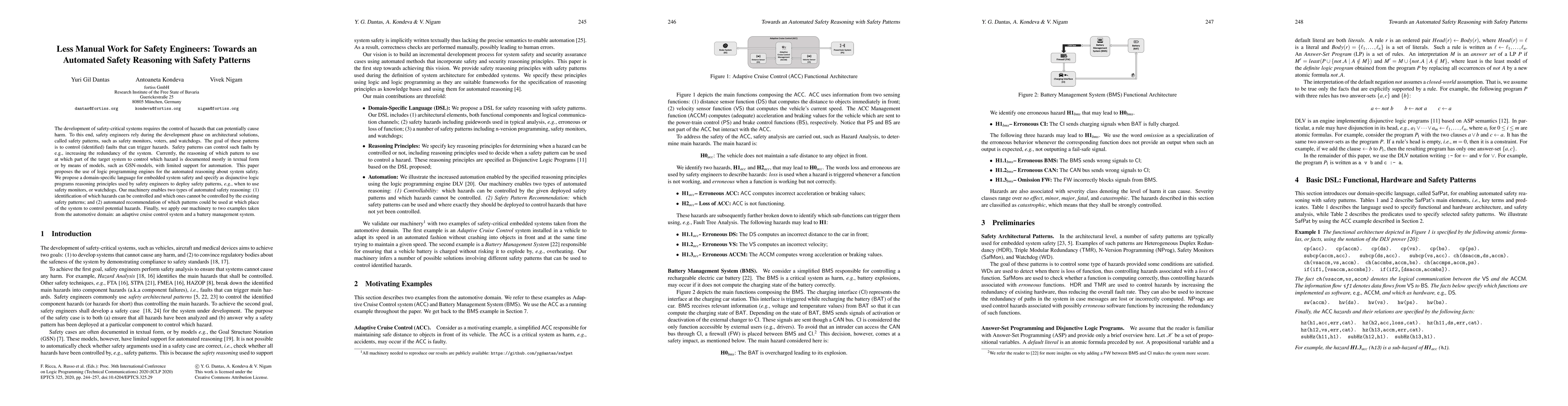 The development of safety-critical systems requires the control of hazards that can potentially cause harm. To this end, safety engineers rely during the development phase on architectural solutions, called safety patterns, such as safety monitors, voters, and watchdogs. The goal of these patterns is to control (identified) faults that can trigger hazards. Safety patterns can control such faults by e.g., increasing the redundancy of the system. Currently, the reasoning of which pattern to use at which part of the target system to control which hazard is documented mostly in textual form or by means of models, such as GSN-models, with limited support for automation. This paper proposes the use of logic programming engines for the automated reasoning about system safety. We propose a domain-specific language for embedded system safety and specify as disjunctive logic programs reasoning principles used by safety engineers to deploy safety patterns, e.g., when to use safety monitors, or watchdogs. Our machinery enables two types of automated safety reasoning: (1) identification of which hazards can be controlled and which ones cannot be controlled by the existing safety patterns; and (2) automated recommendation of which patterns could be used at which place of the system to control potential hazards. Finally, we apply our machinery to two examples taken from the automotive domain: an adaptive cruise control system and a battery management system.